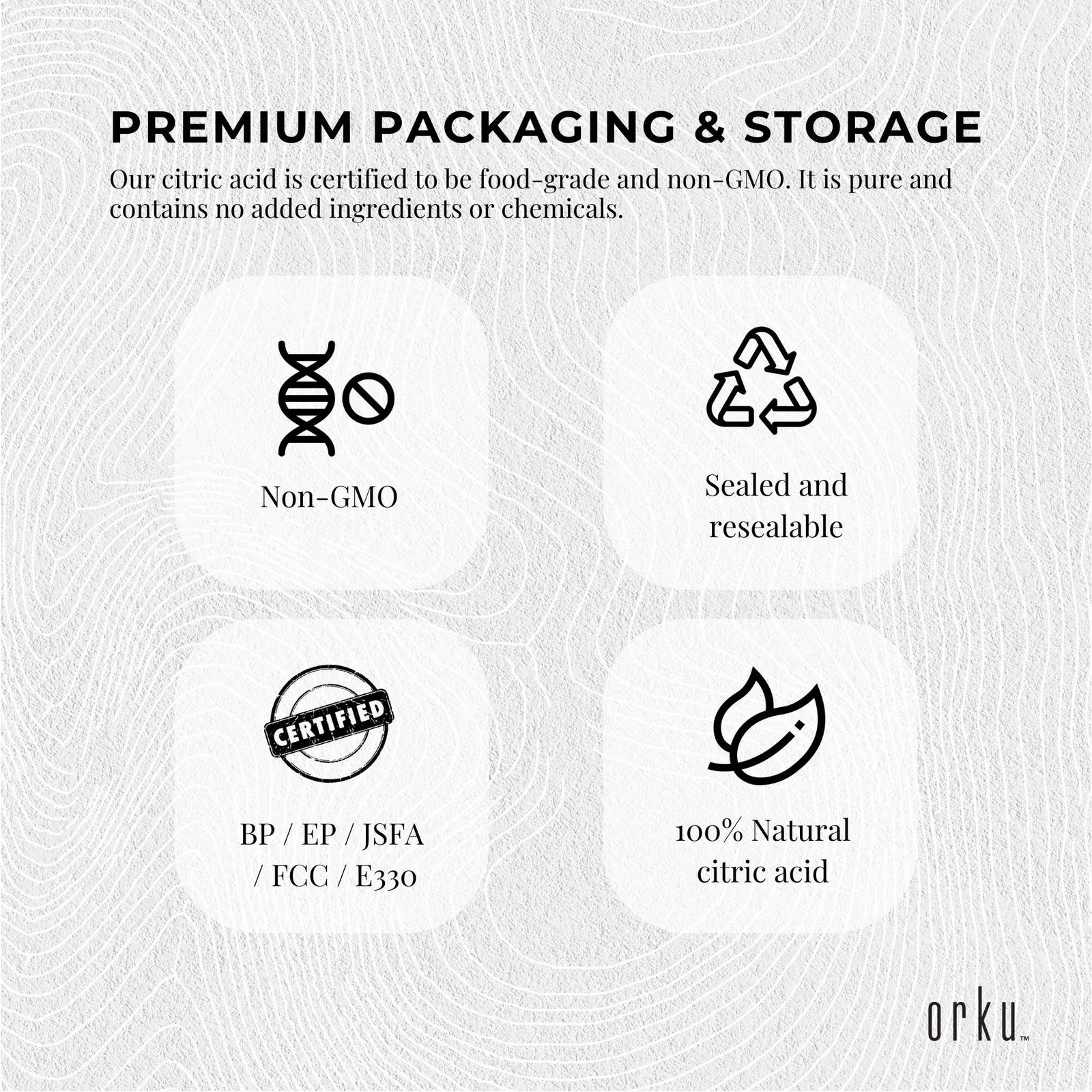 Our Citric Acid is fully compliant Food Grade GMO Free Certified BP / EP / JSFA / FCC / E330. Packages come in sealed buckets.