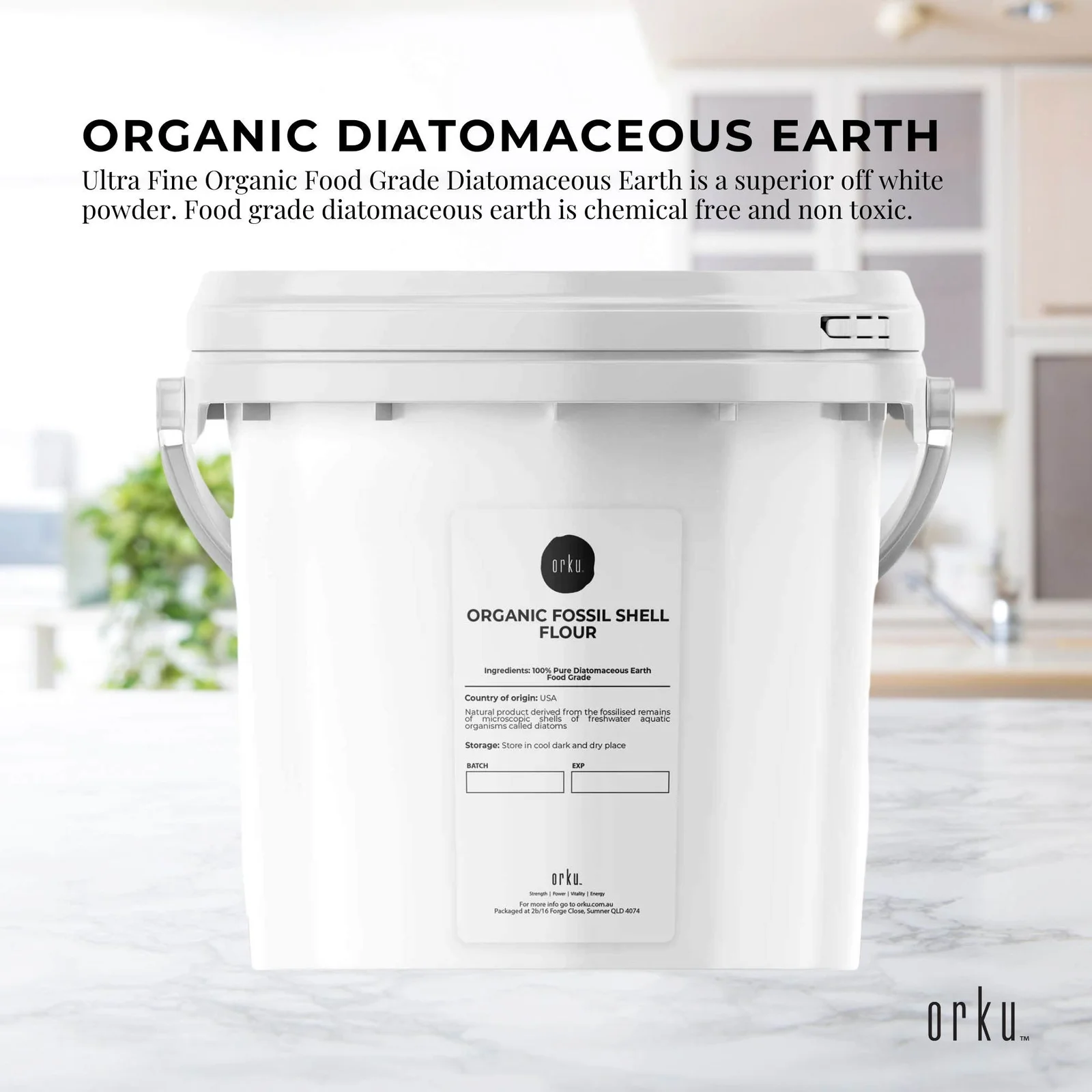 Diatomaceous Earth Powder in resealable bucket.