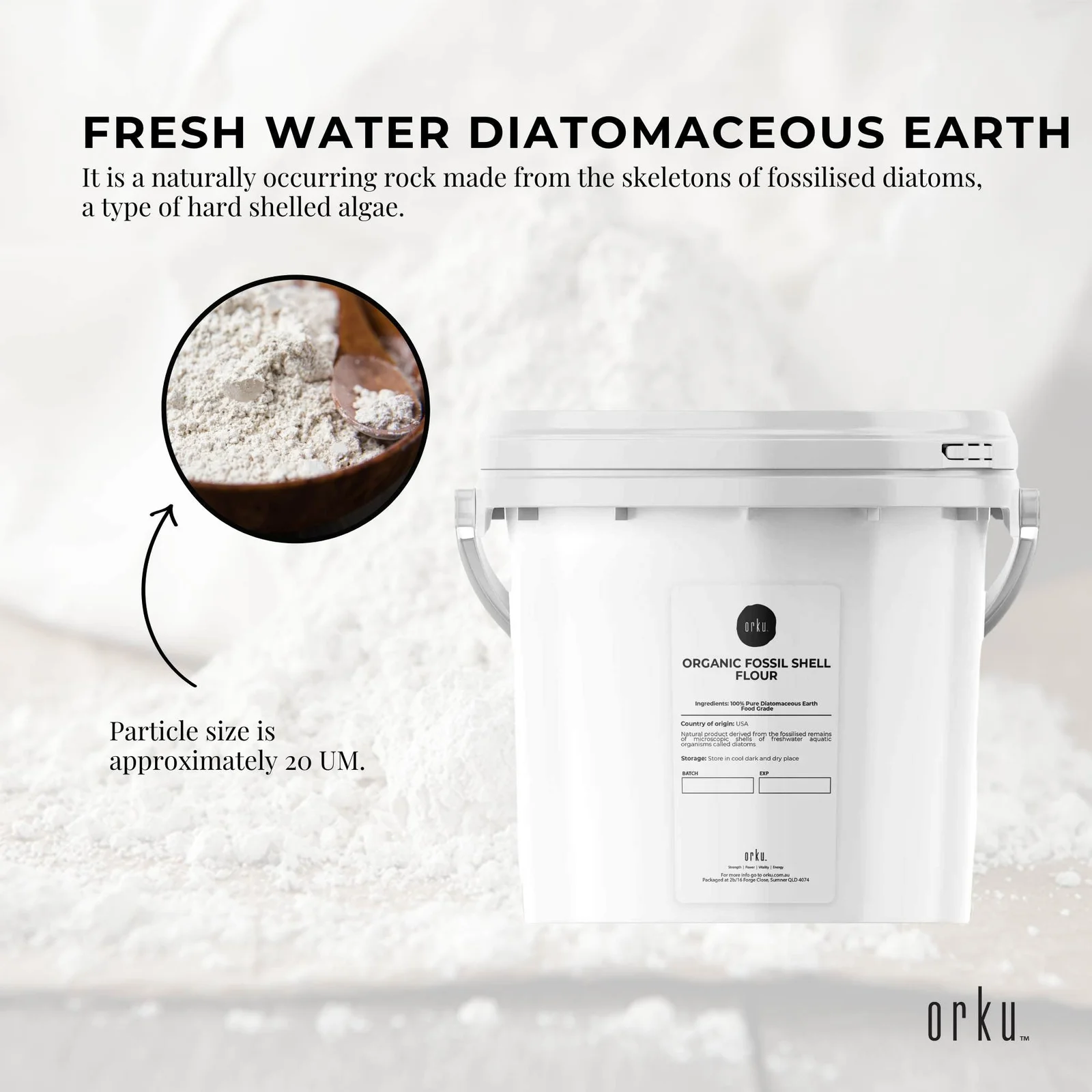 Ultra Fine Organic Food Grade Diatomaceous Earth is a superior off white powder, sterilised for consuming by heat treating via sunshine or UV light - enough to kill bacteria and pathogens but not harm the Diatomaceous Earth. It is 100% pure and contains less than 1% of crystal and silicon. Particle size is approximately 20 UM.