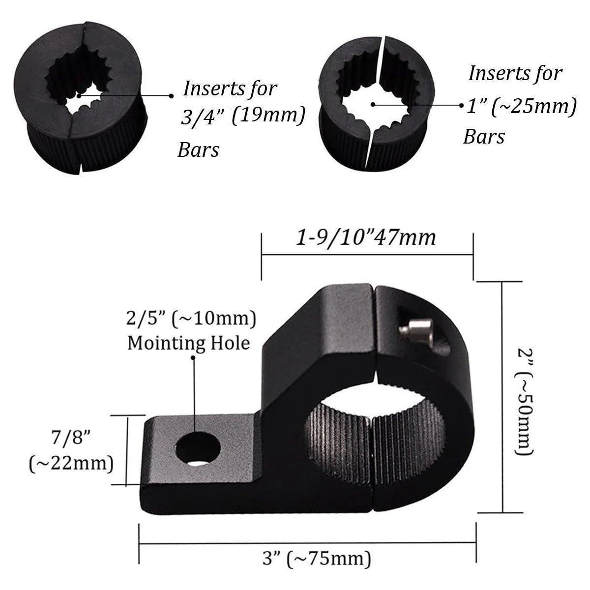 Clamp Sizes: Fits bars with diameters of 19mm (3/4”) and 25mm (1”)