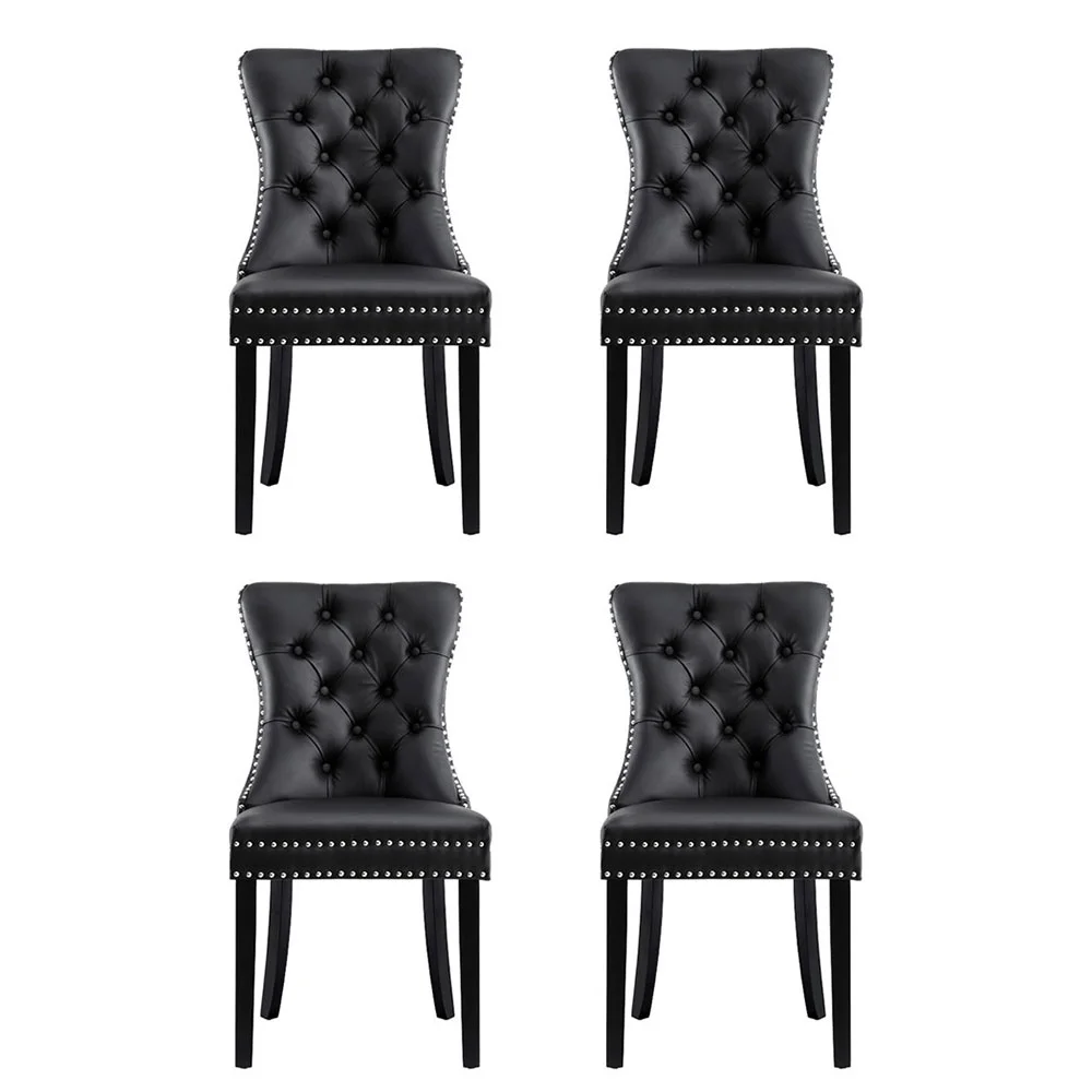 Elevate your dining space with this set of 4 Artiss Dining Chairs, designed to bring timeless charm to your home. Upholstered in your choice of PU leather or plush velvet, the chairs feature a button-tufted backrest and rivet edging for a sophisticated look. Crafted with a cushioned backrest filled with high-resilience foam, these chairs provide exceptional comfort during meals and gatherings. The rubberwood legs ensure reliable support, while anti-slip feet protect your floors. Perfectly blending style and practicality, these dining chairs make a stunning addition to any dining room.