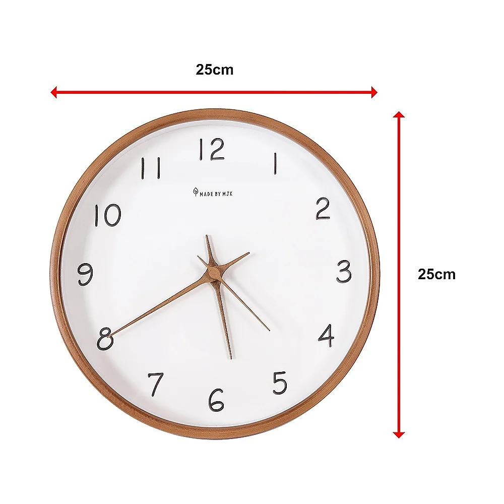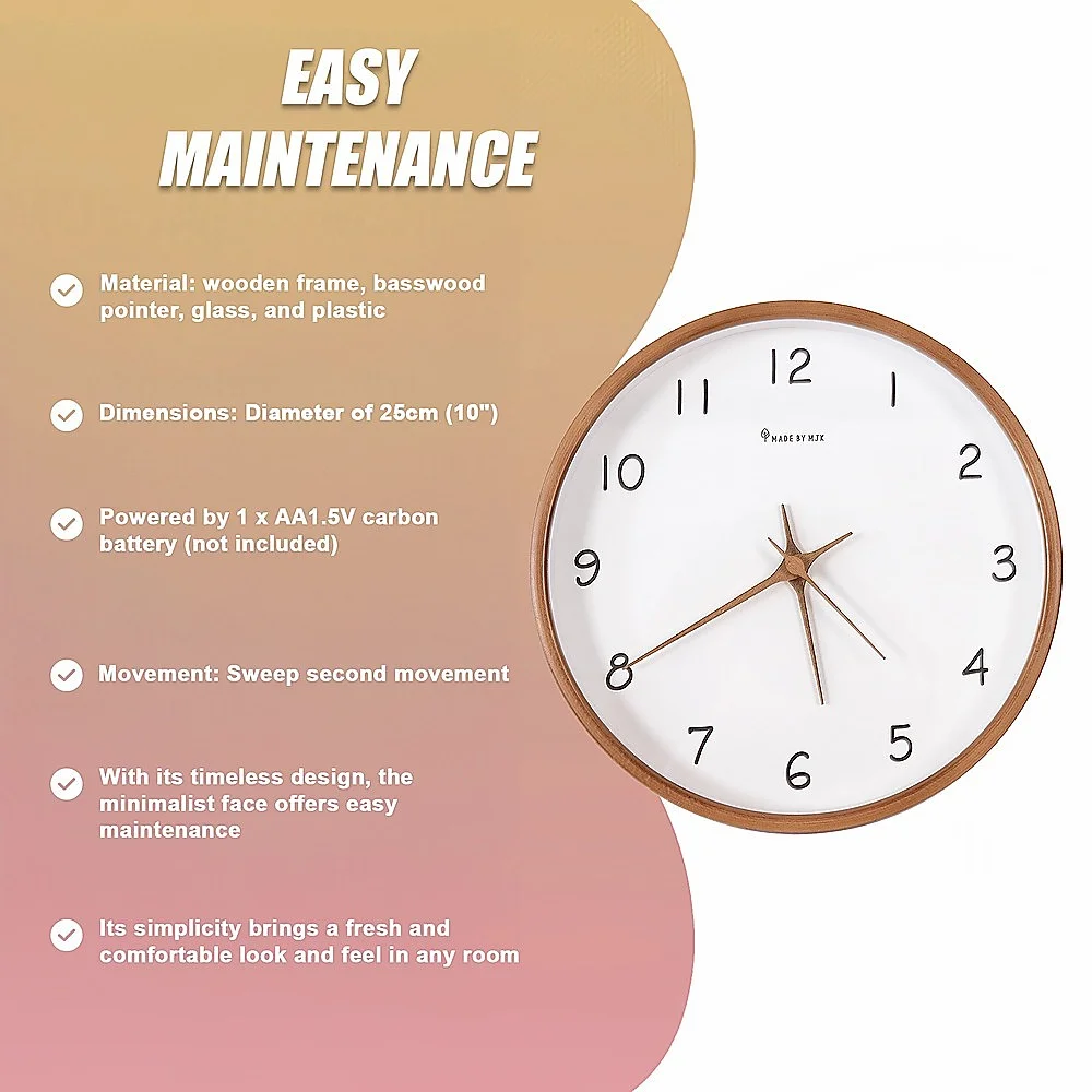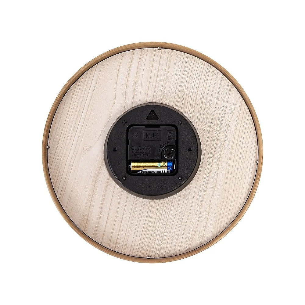 Driven by a battery-powered mechanism, this clock ensures unwavering functionality during power outages or electrical disruptions. Encased in natural solid wood, its simplicity brings a fresh and comfortable look and feel in any room. This clock effortlessly complements any room within a household, or even in an office, adding an attractive accent that contributes to the visual allure of its surroundings.