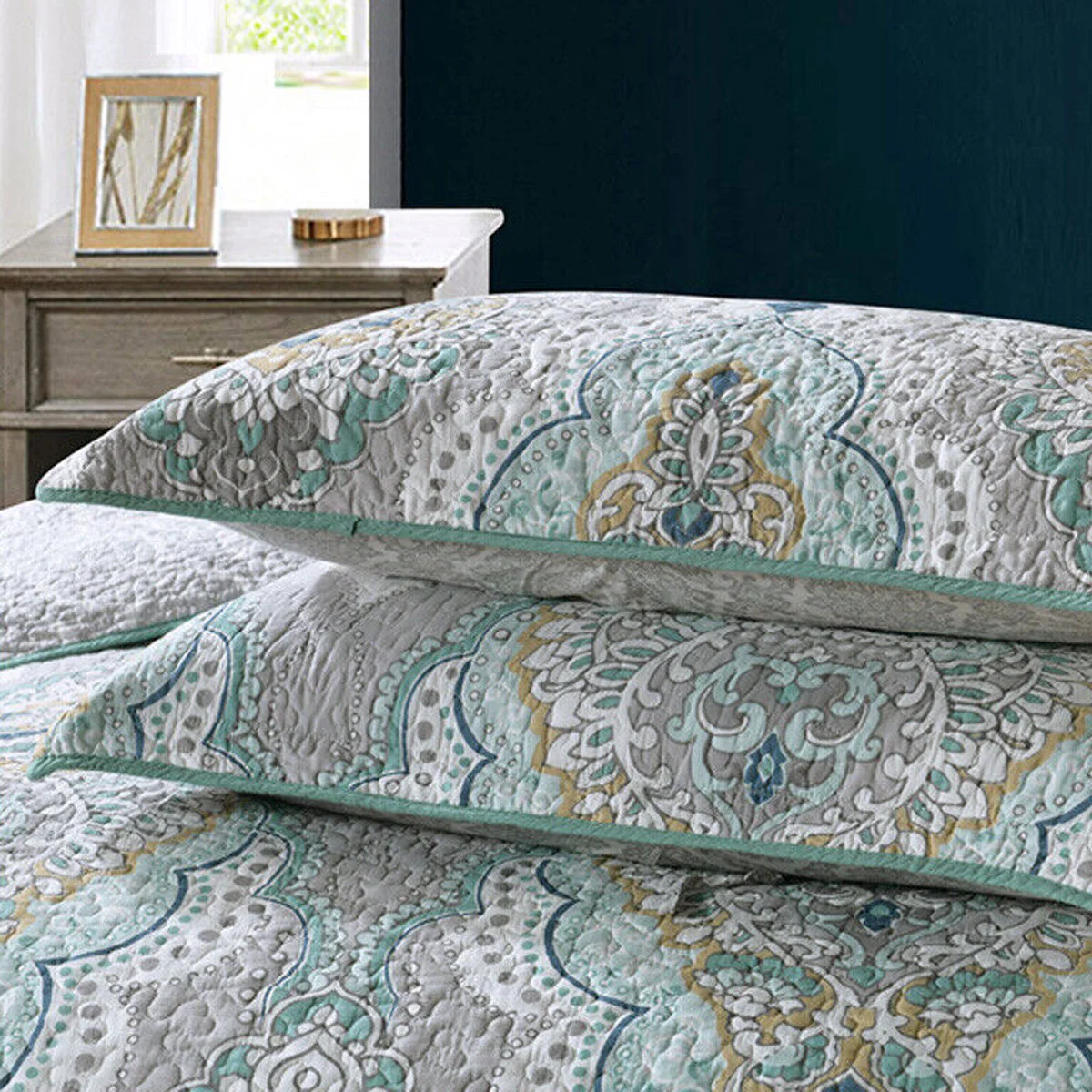 Elevate your sleep sanctuary with the 100% Cotton Cover Lightly Quilted Coverlet Set Regency Taupe Queen - a blend of sophistication and snugness. It features damask design in white, taupe, grey, teal, blue, and mustard hues exudes timeless charm. Made from soft and breathable cotton, this set combines comfort with elegance.