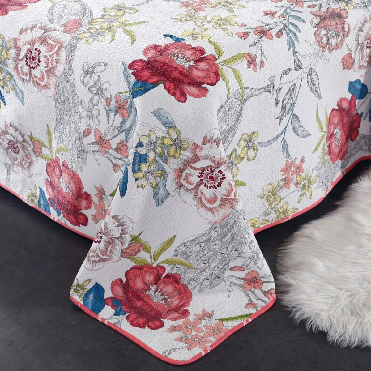 Embrace the beauty of nature with our 100% Cotton Lightly Quilted Coverlet Set Peacock Garden Pink Queen. This exquisitely crafted coverlet features a stunning peacock design, complete with lush greenery and vibrant flowers in pink, red, white, brown, rose, burgundy, green, teal, black, and yellow colour tones. The 100% cotton fabric is soft and comfortable, while the lightweight quilting provides just the right amount of warmth.