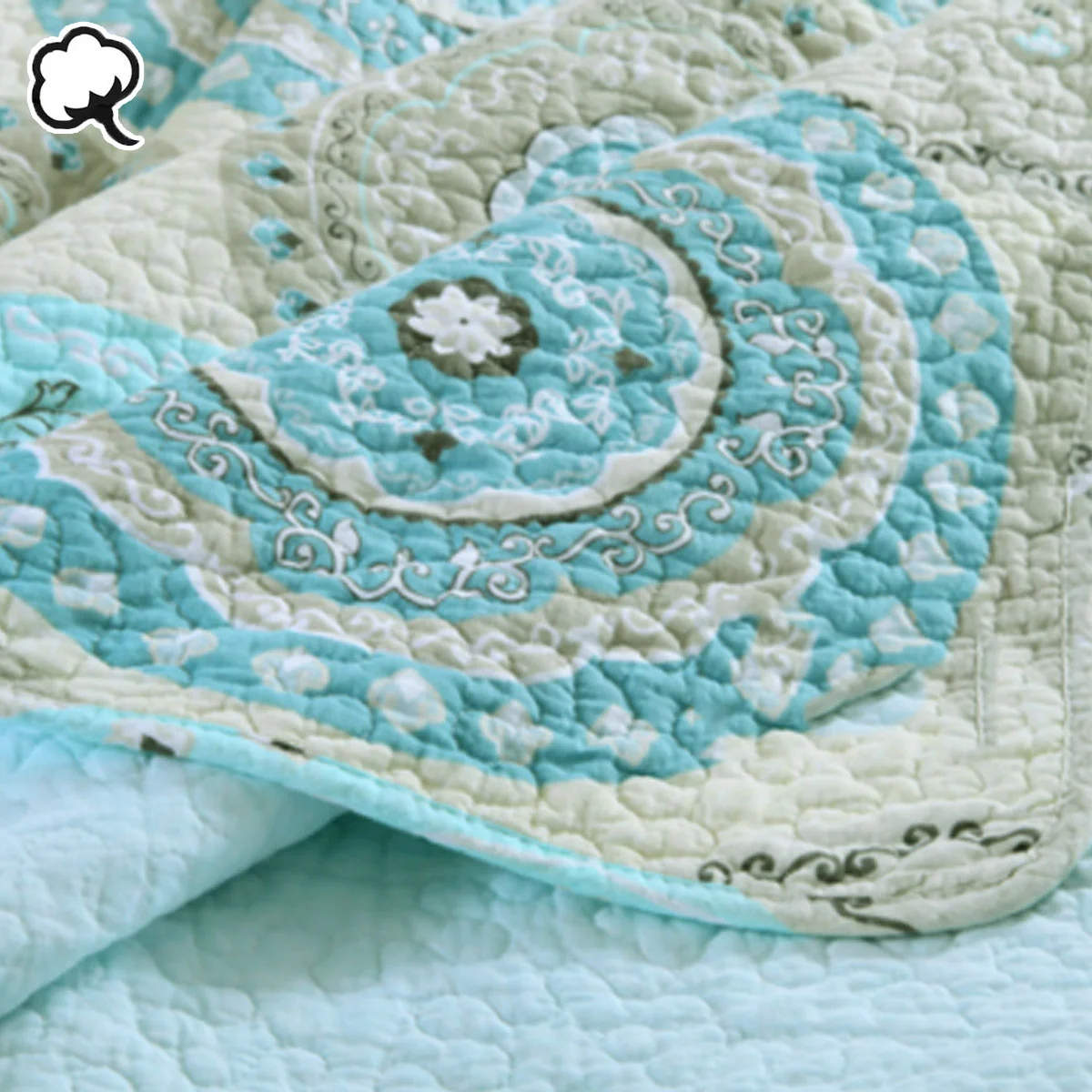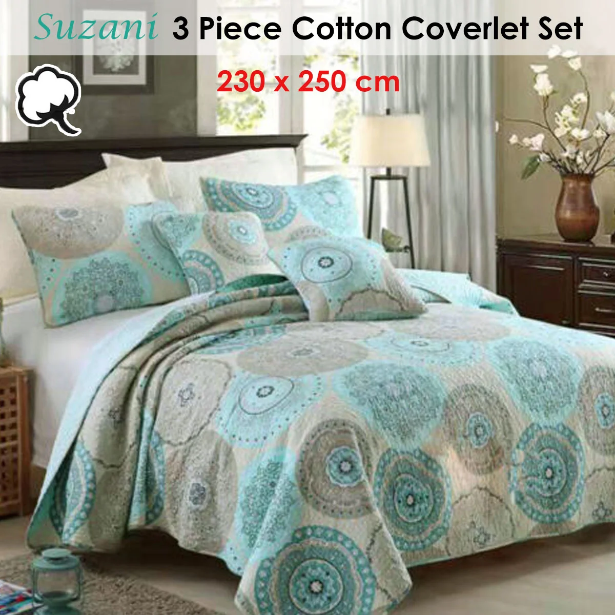 This contemporary 100% Cotton Lightly Quilted Coverlet Set Suzani Queen will help you create your dream bedroom style. It features a soothing quilted mandala circles design in soft colour hues of turquoise, cream, brown, and white. Approx 150gsm filling. Exquisite quilting process of quit set can maintain cotton filler effectively. Light weight, medium warmth, year-round use Easy-Care Machine Washable, Prewashed and preshrunk. It is made from soft touch and easy care 100% Cotton fabric and Pure Cotton filling with softness that offers a relaxing night's sleep.
