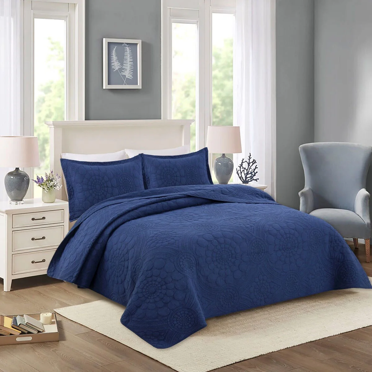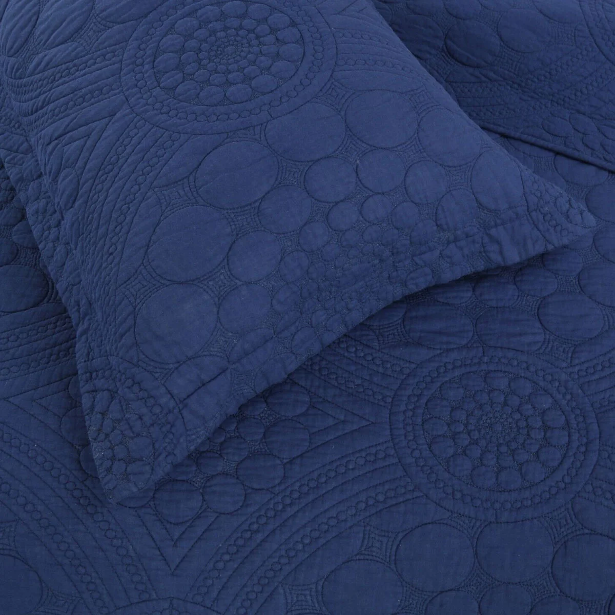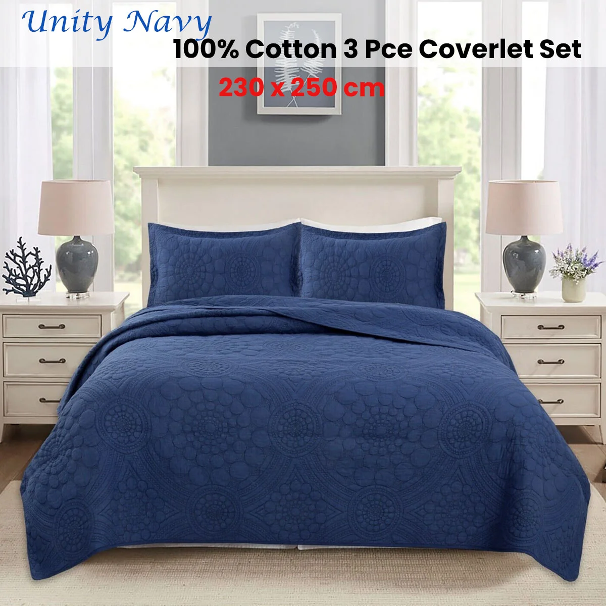 Transform your bedroom into a serene retreat with this elegant 100% Cotton Lightly Quilted Coverlet Set Unity Navy Queen - a blend of comfort and refinement. It features quilted geometric patterns in neutral colour tone that will complement various aesthetics. Made from soft and breathable cotton, this set combines comfort with sophistication.