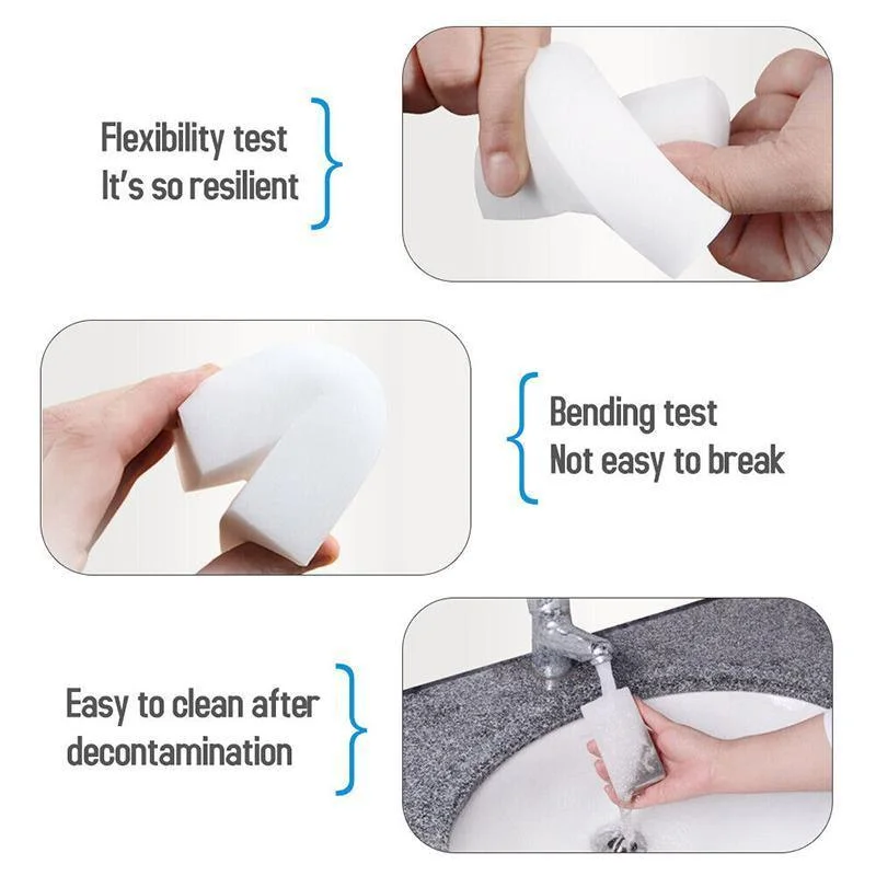 Simplify your daily cleaning tasks with this set of Nano Magic Sponge Erasers. Made from high-density melamine foam, these chemical-free sponges clean effectively using only water—no detergent required. Whether it's stubborn kitchen grime, wall marks, or bathroom buildup, these sponges handle it all with ease.