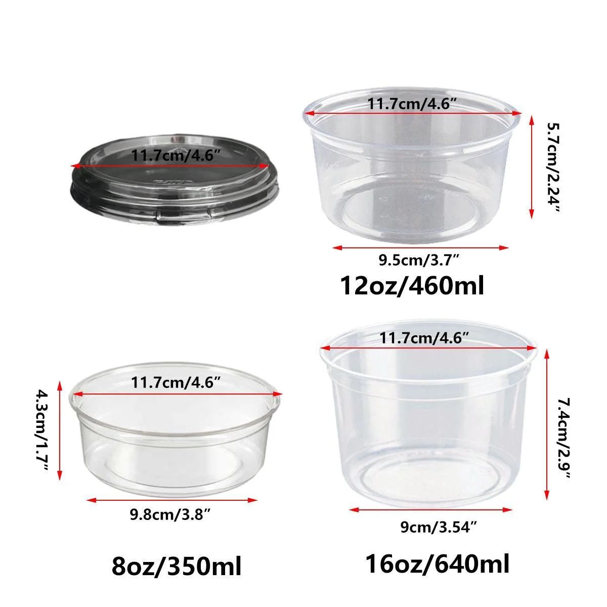 These transparent food-grade bowls with secure lids are ideal for packaging desserts, salads, snacks, and other food items. Made from high-quality PET material, they are lightweight, durable, and resistant to leaks and spills. The airtight lid design helps preserve freshness and prevents food from being exposed to air or moisture. With a clear appearance, these bowls enhance food presentation, making them perfect for bakeries, restaurants, catering, or home use. Designed for easy stacking and storage, these bowls are a convenient choice for takeout, meal prep, or party servings.