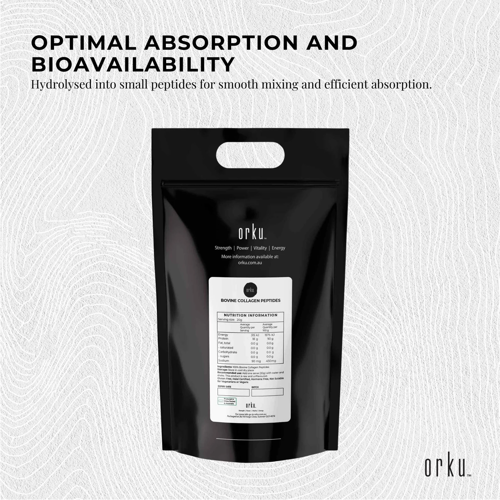 Orku Bovine Collagen Hydrolysate is a bioactive peptide protein that supports the body's own collagen found in bones, joints, skin, hair, and nails.