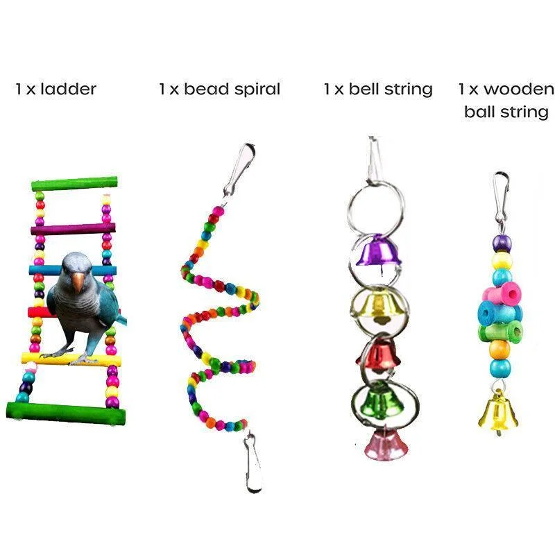 10pcs bird toy set includes ladders, swings, chew toys, and bell toys for variety and fun