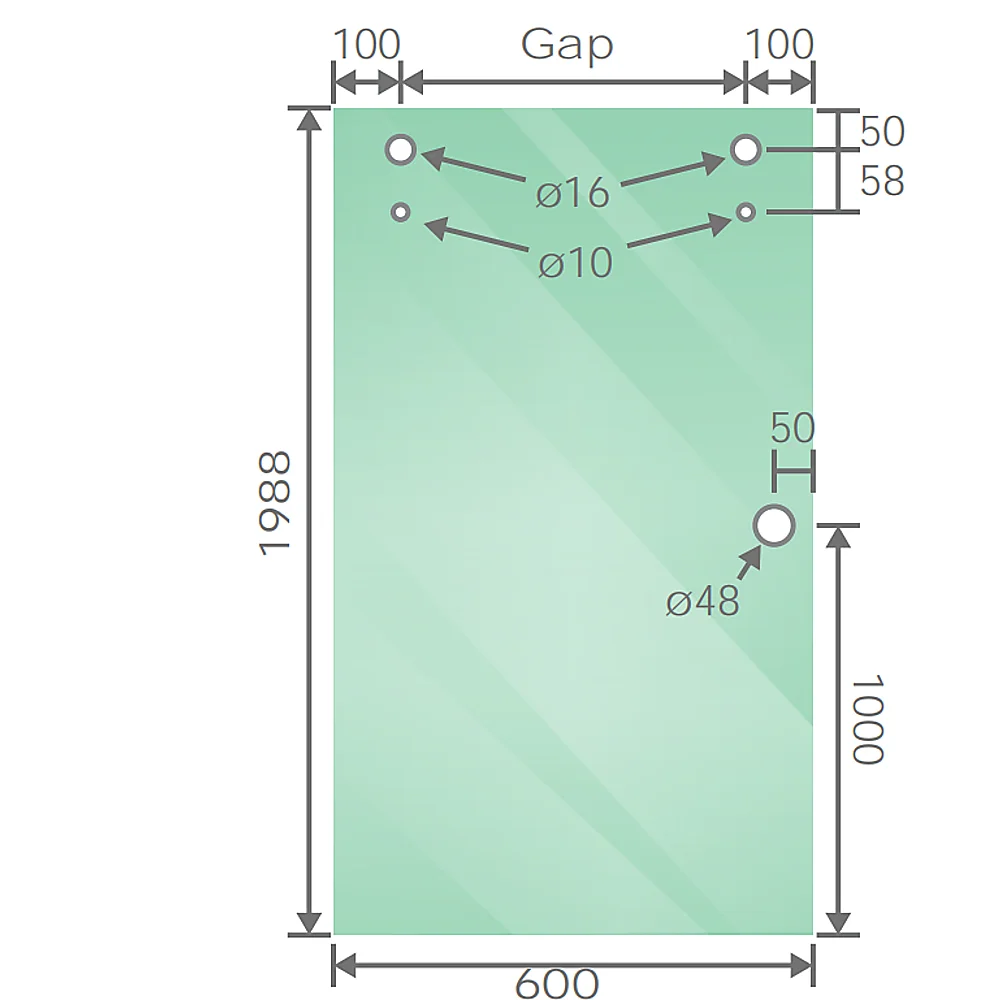 Tailored for a frameless shower screen featuring a sliding door, glass screen for the side panel showcases 10mm clear toughened glass with 2mm radius corners and polished edges. All measurements are in millimeters, and the panels come pre-drilled to seamlessly fit various styles of shower hardware.