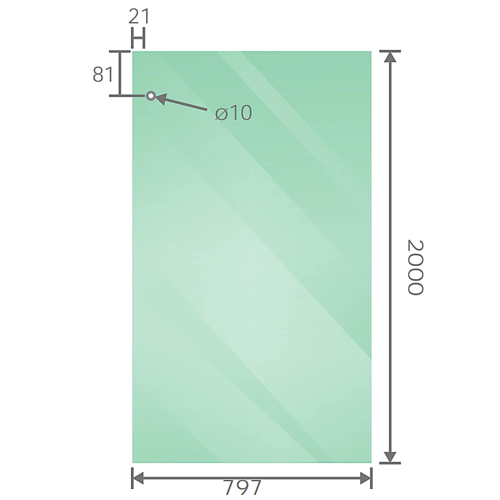 Tailored for a frameless shower screen featuring a sliding door, glass screen for the side panel showcases 10mm clear toughened glass with 2mm radius corners and polished edges. All measurements are in millimeters, and the panels come pre-drilled to seamlessly fit various styles of shower hardware.