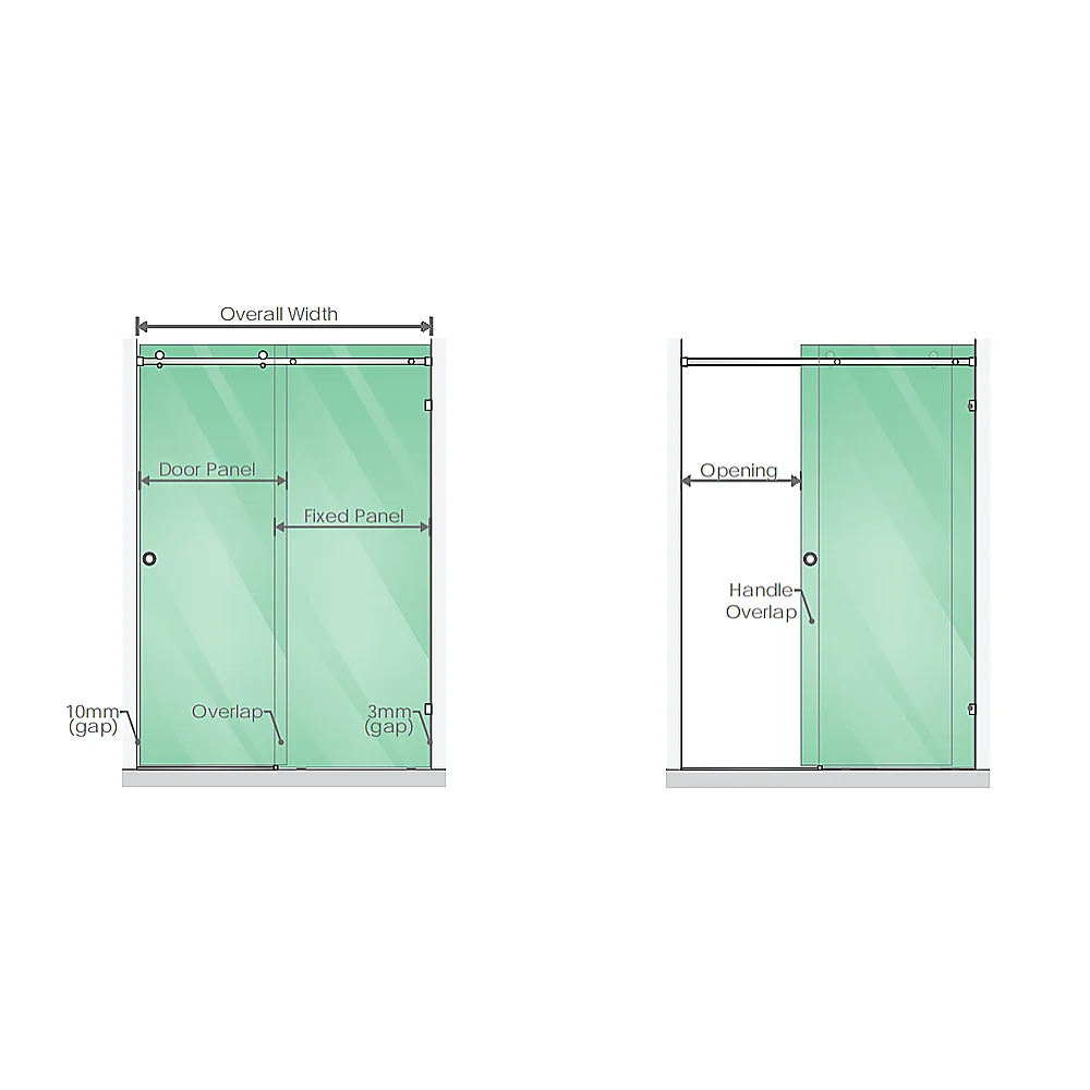 Tailored for a frameless shower screen featuring a sliding door, glass screen for the side panel showcases 10mm clear toughened glass with 2mm radius corners and polished edges. All measurements are in millimeters, and the panels come pre-drilled to seamlessly fit various styles of shower hardware.