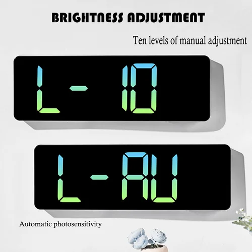 LED digital clock has 10 levels of brightness. You can manually adjust it to an agreeable level through the remote to avoid disturbing glare while sleeping. It can also automatically adjust the brightness as the ambient light changes, so it won't be too bright at night. Also, you can turn it off if desired.