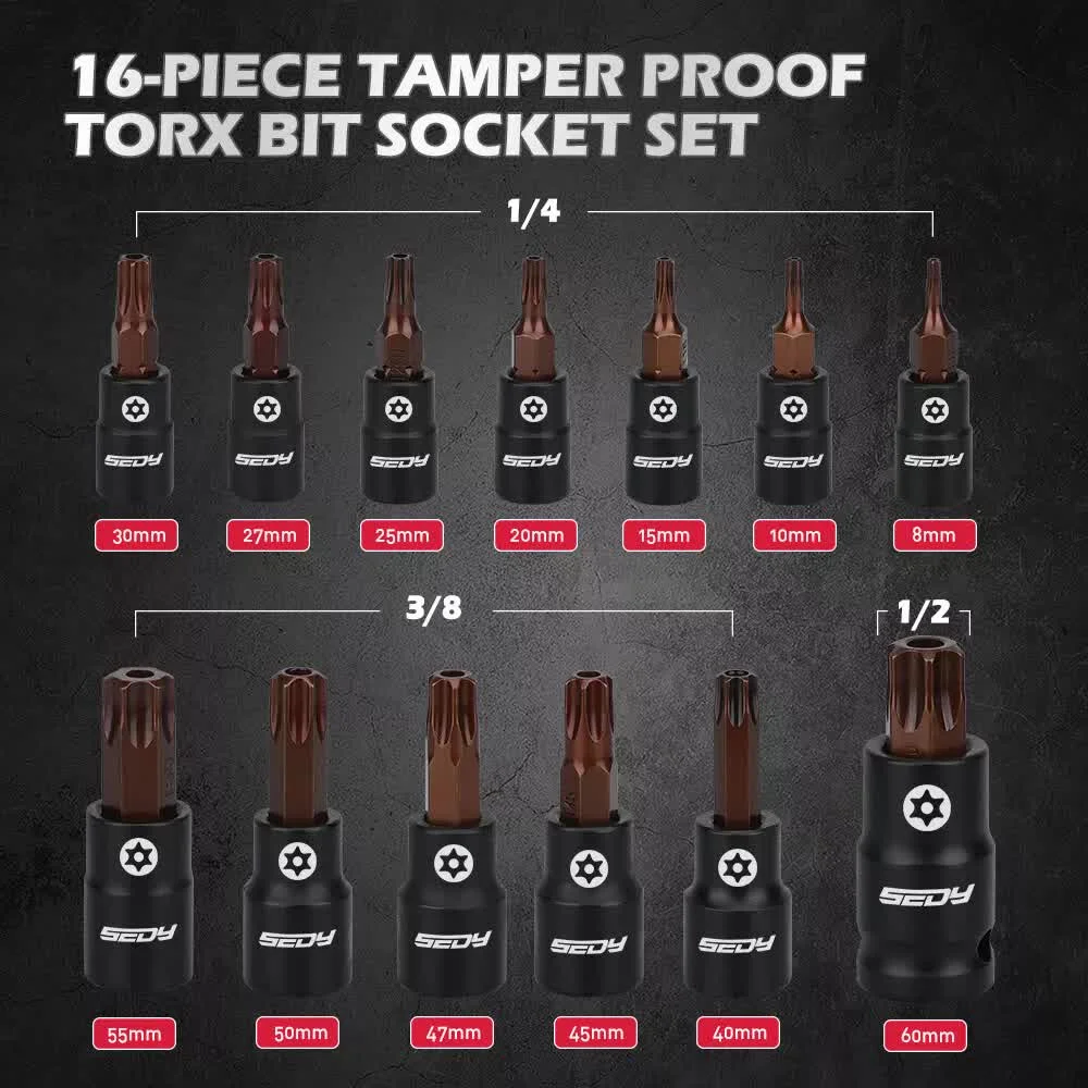 PREMIUM QUALIT - 16-piece master Torx bit socket set, including a wide range of T8-T60 star bit sockets and 3 pcs adapters, crafted from S2 alloy steel for superior torque and durability. Very suitable for DIY enthusiasts and professionals.