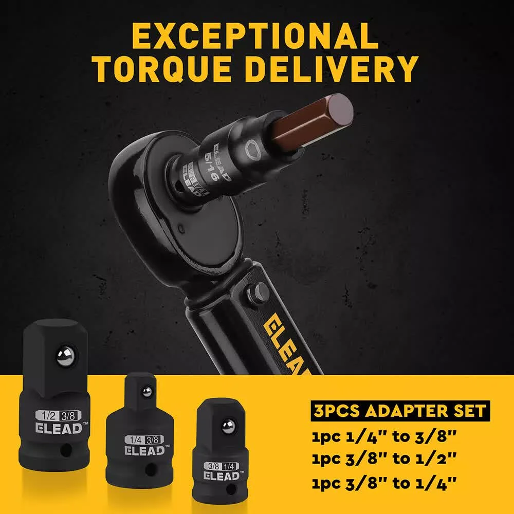 Multi-size Coverage This 16-piece set covers all your needs, including 1/4" drive (5/64, 3/32, 1/8, 5/32, 3/16, 7/32, 1/4), 3/8" drive (9/32, 5/16, 3/8, 7/16, 1/2), and 1/2" drive (9/16), plus 3 socket adapters. Each socket features a detent pin hole for added stability and precision.