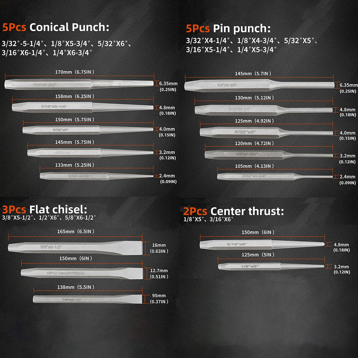 Multi-Tool Variety: Taper punches, pin punches, cold chisels, center punches, and a gauge cover diverse tasks.