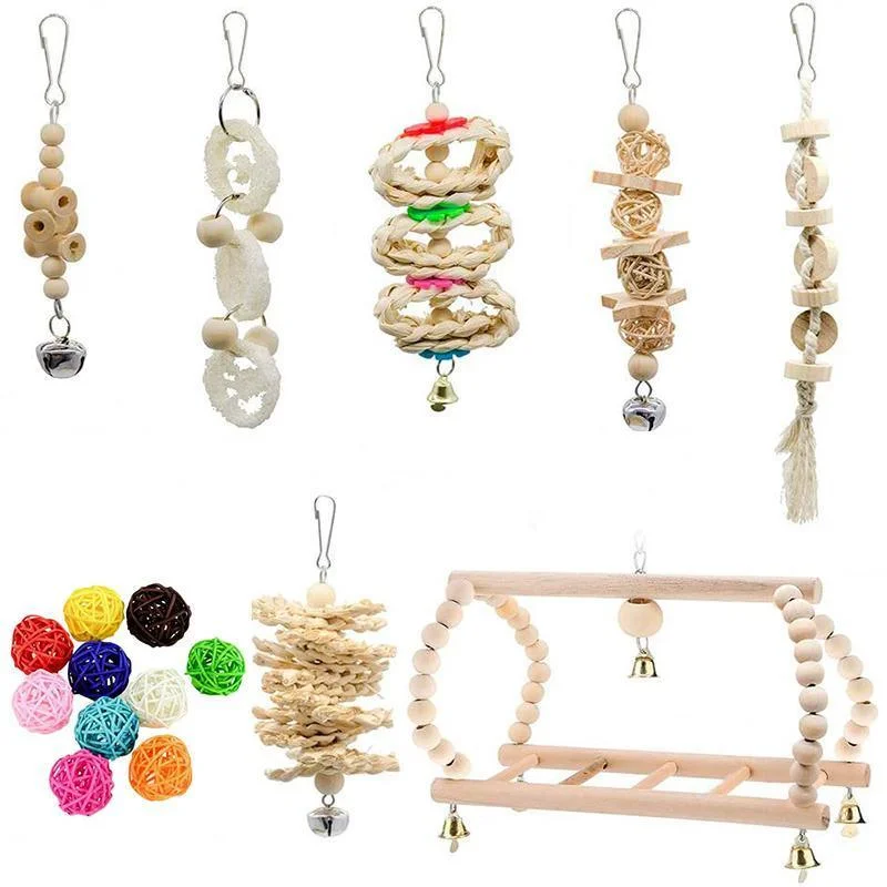 -The best birdcage toys: This multi-functional toy set meets the natural needs of most birds, such as parakeets, parrots, mynah, small macaw, cockatiels, conures, love birds, finches, and the other medium and small birds.