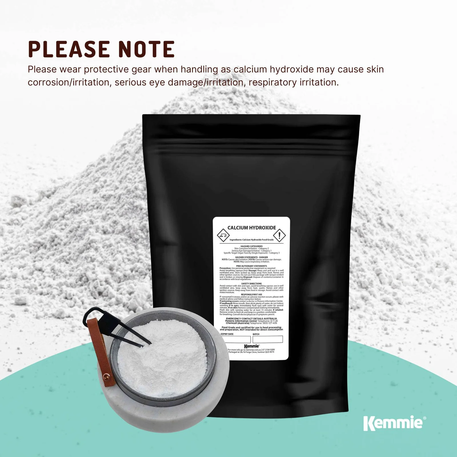 Please Note: Please wear protective gear when handling as calcium hydroxide may cause skin corrosion/irritation, serious eye damage/irritation, respiratory irritation.