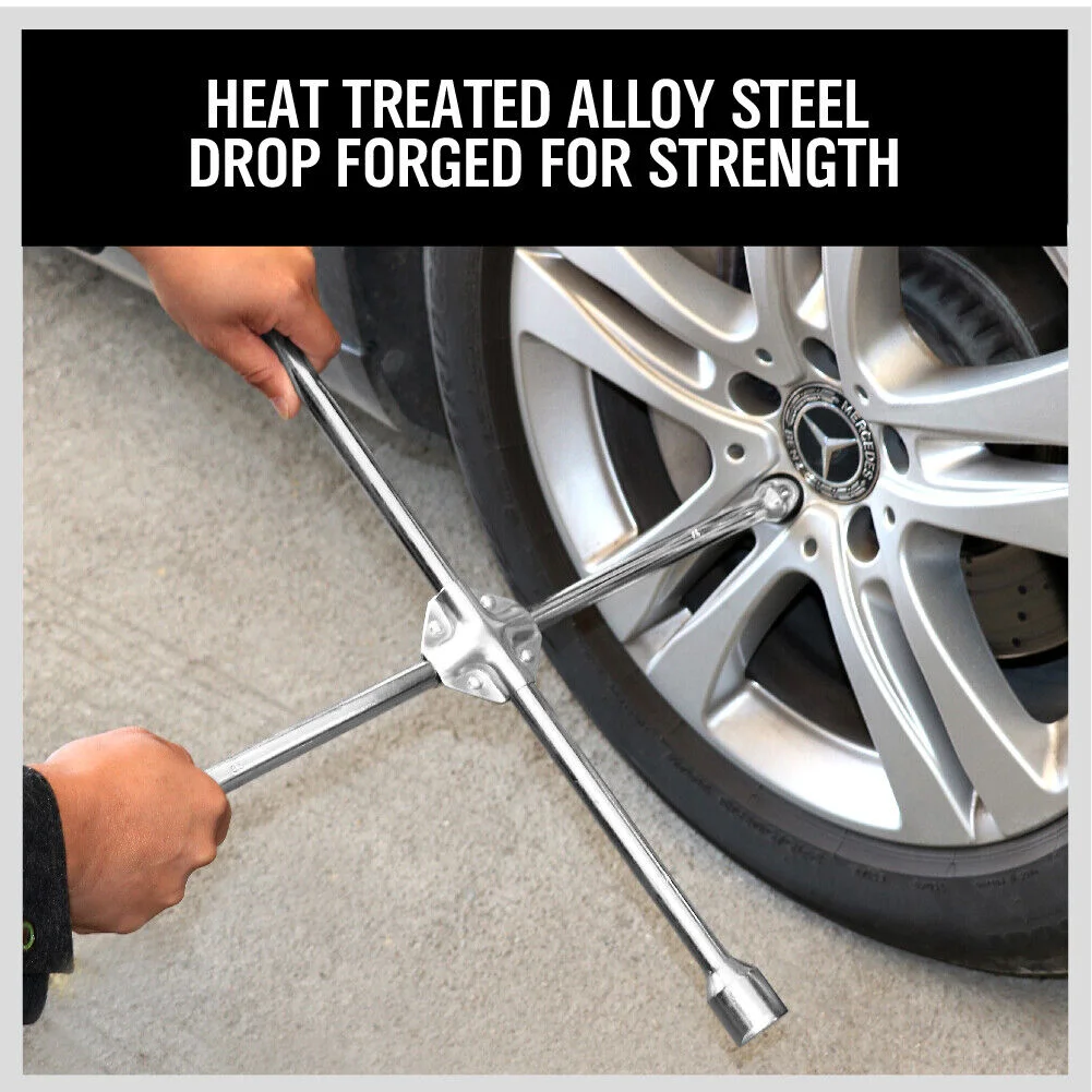 Description: 4 Way cross wheel wrench for Labor-Saving Lengthening Disassembly Perfect for keeping in your tool kit, garage or even in your car Comes with 4 sizes of sockets (17mm, 19mm, 21mm, 23mm). Hardened with corrosion-resistant chrome finish Durable, quick and effective way to remove wheel nuts