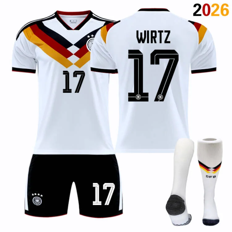 Each set includes: 1 white short-sleeved home jersey, 1 matching shorts, and 1 themed sock.