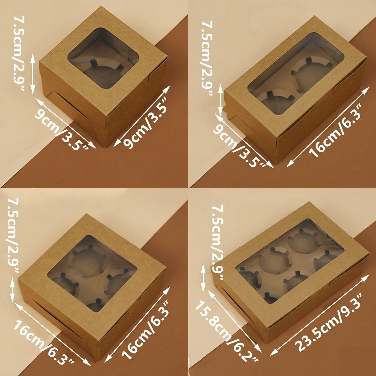 These eco-friendly paper cupcake boxes are designed for convenient and stylish storage of cupcakes, muffins, and other baked goods. Each box includes a clear window that beautifully showcases your treats while keeping them fresh and protected. Made from high-quality kraft paper, these boxes are sturdy, durable, and ideal for professional and personal use. Their elegant design makes them perfect for gifting and displaying baked goods at parties, weddings, or events.