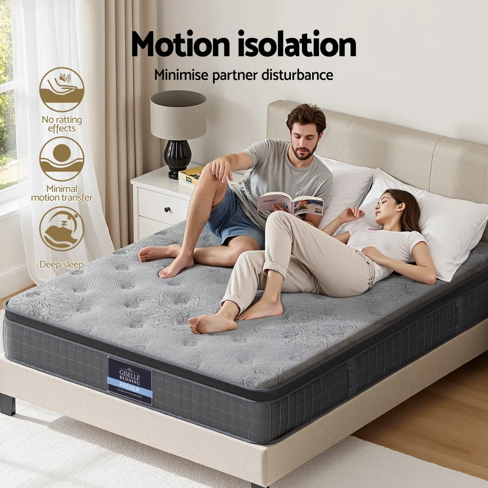 Experience balanced comfort with the Giselle Bedding DOVE Series. The 26cm profile combines natural latex foam for responsive cushioning with a bamboo charcoal fabric cover that promotes airflow. The Euro Top layer gently contours to pressure points, while high compression pocket springs and 6-turn coils provide zoned support. Reinforced edges maximise sleeping surface, and the medium-firm density suits most sleep positions.