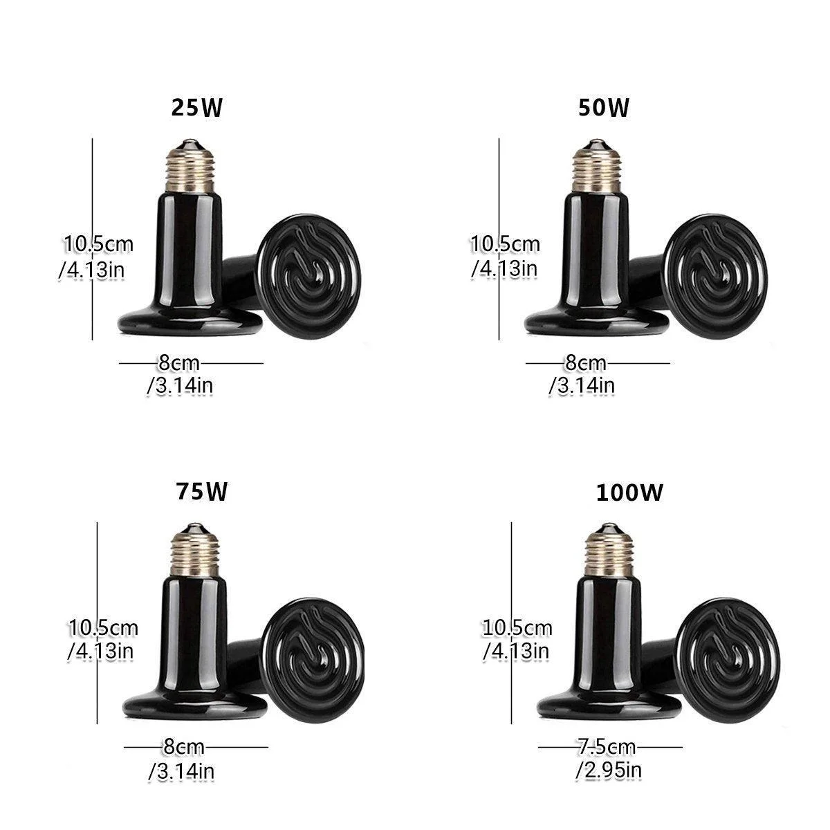 The Ceramic Heat Lamp Bulb Infrared Reptile Heating Unit is an efficient and durable solution for your reptile or amphibian pet's habitat. This lamp provides a consistent source of heat without emitting any visible light, ensuring it doesn't disturb your pet's sleep cycle. Available in various wattages (25W, 50W, 75W, 100W), it caters to different heating needs, providing a safe and comfortable environment for a wide range of animals including lizards, turtles, snakes, and more.