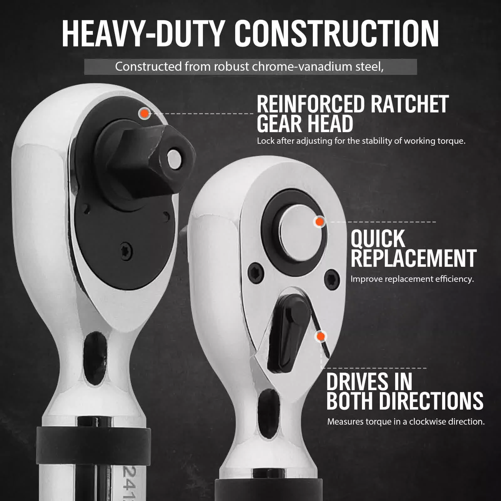 Constructed for Longevity: Constructed from robust chrome-vanadium steel, this heavy-duty torque wrench undergoes a rigorous six-stage heat-treated process and chrome-plated surface coating for optimal resistance to rust and corrosion. Additionally, the electronic torque wrench's smooth surface facilitates easy cleaning.