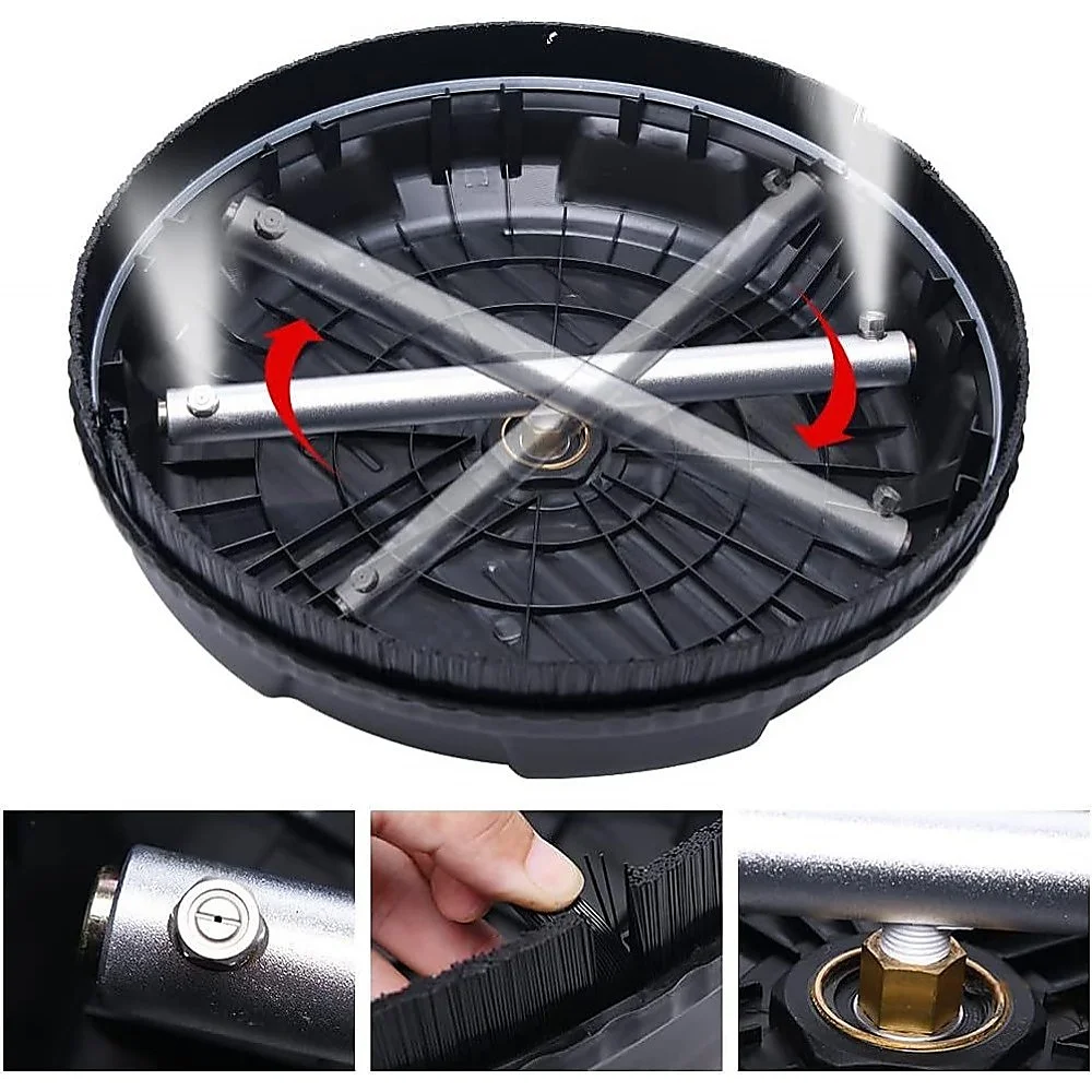 Constructed from durable materials including heavy-duty brass, stainless steel, and durable composites, it guarantees long-lasting durability. The cleaner's tough yet flexible bristles protect the work surface and effectively control overspray. It's specifically designed for cleaning expansive surfaces like driveways, decks, as well as vertical surfaces such as brick walls and siding.