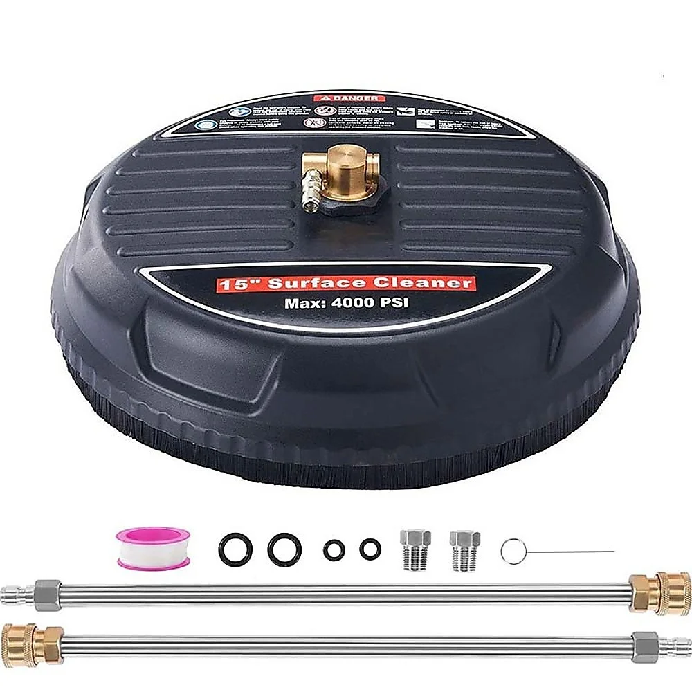 Our Pressure Washer Surface Cleaner is expertly engineered for efficiently cleaning large areas, such as driveways and pathways, providing professional-level results with its 44cm wide coverage and two spinning nozzles. Its innovative splash-free design ensures you stay dry during operation. This versatile cleaner is compatible with most gas-powered pressure washers rated up to 4000 PSI.