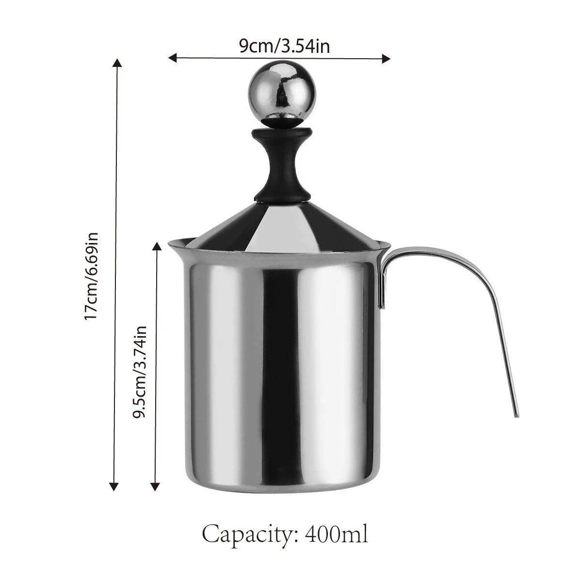 Material: Stainless steel Capacity: 400ml Dimensions: 17cm x 9cm (6.69in x 3.54in) Weight: Lightweight and durable Colour: Polished stainless steel finish Strainer Type: Double mesh filter for smooth frothing