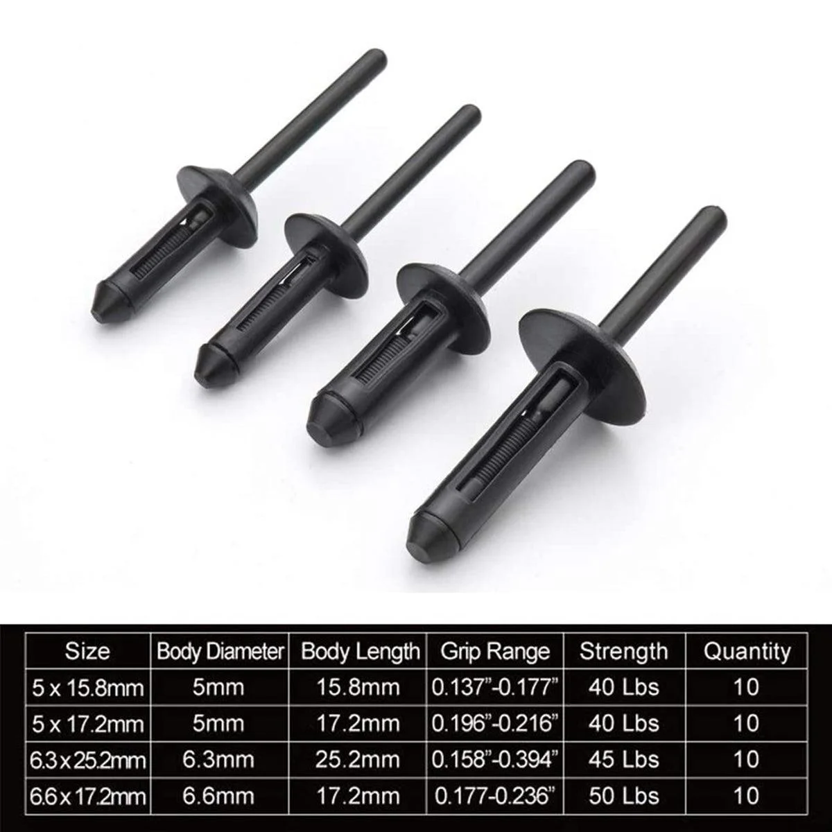 Introducing the 41 Piece Plastic Rivet Tool Set, a comprehensive quick-release polyethylene riveting tool kit designed for all your riveting needs. This versatile tool set is perfect for automotive repairs, household projects, and other applications requiring strong and reliable rivets. The set includes a durable rivet tool and a variety of rivet sizes to handle different materials and thicknesses with ease. Whether you are a professional or a DIY enthusiast, this rivet tool set will provide you with the precision and efficiency you need.