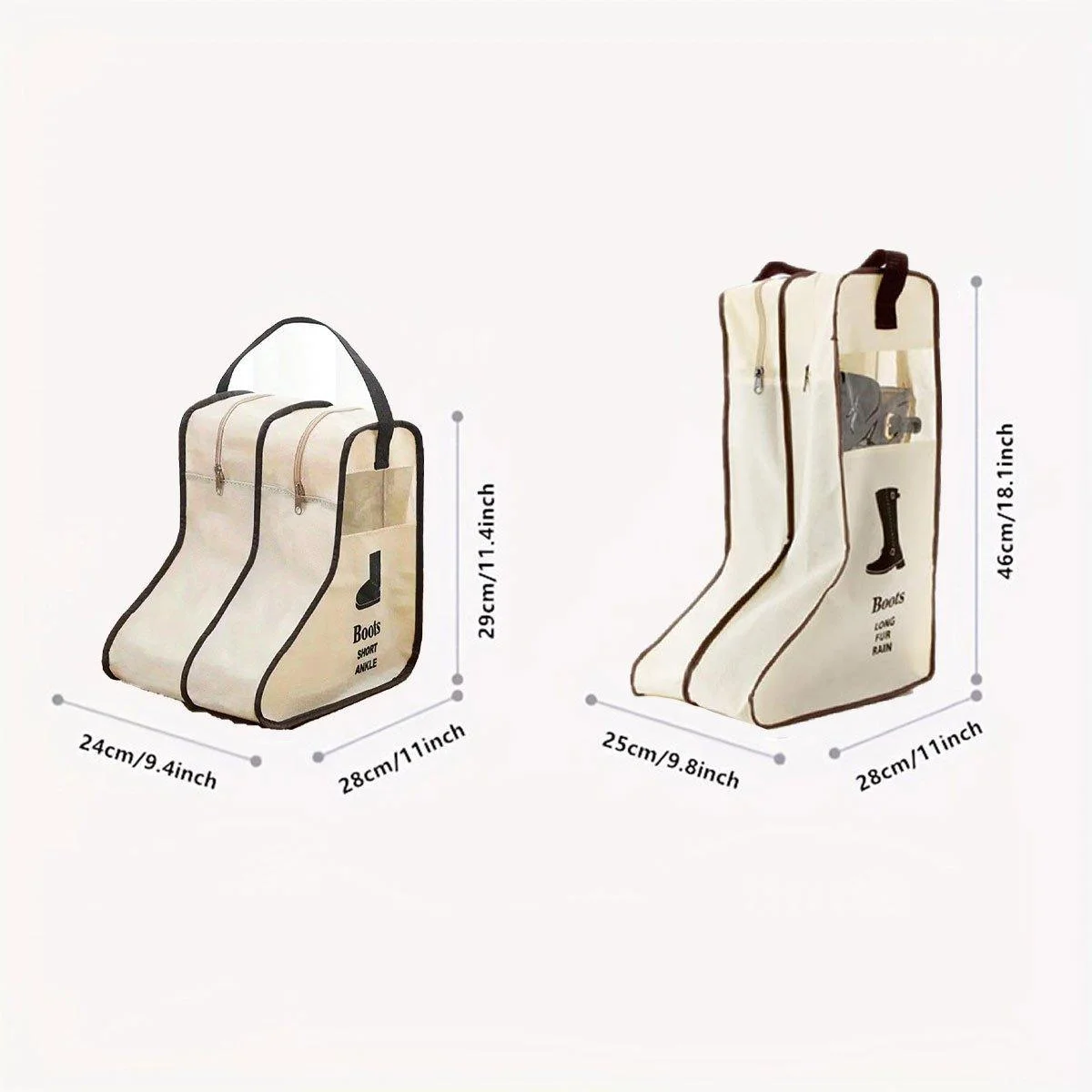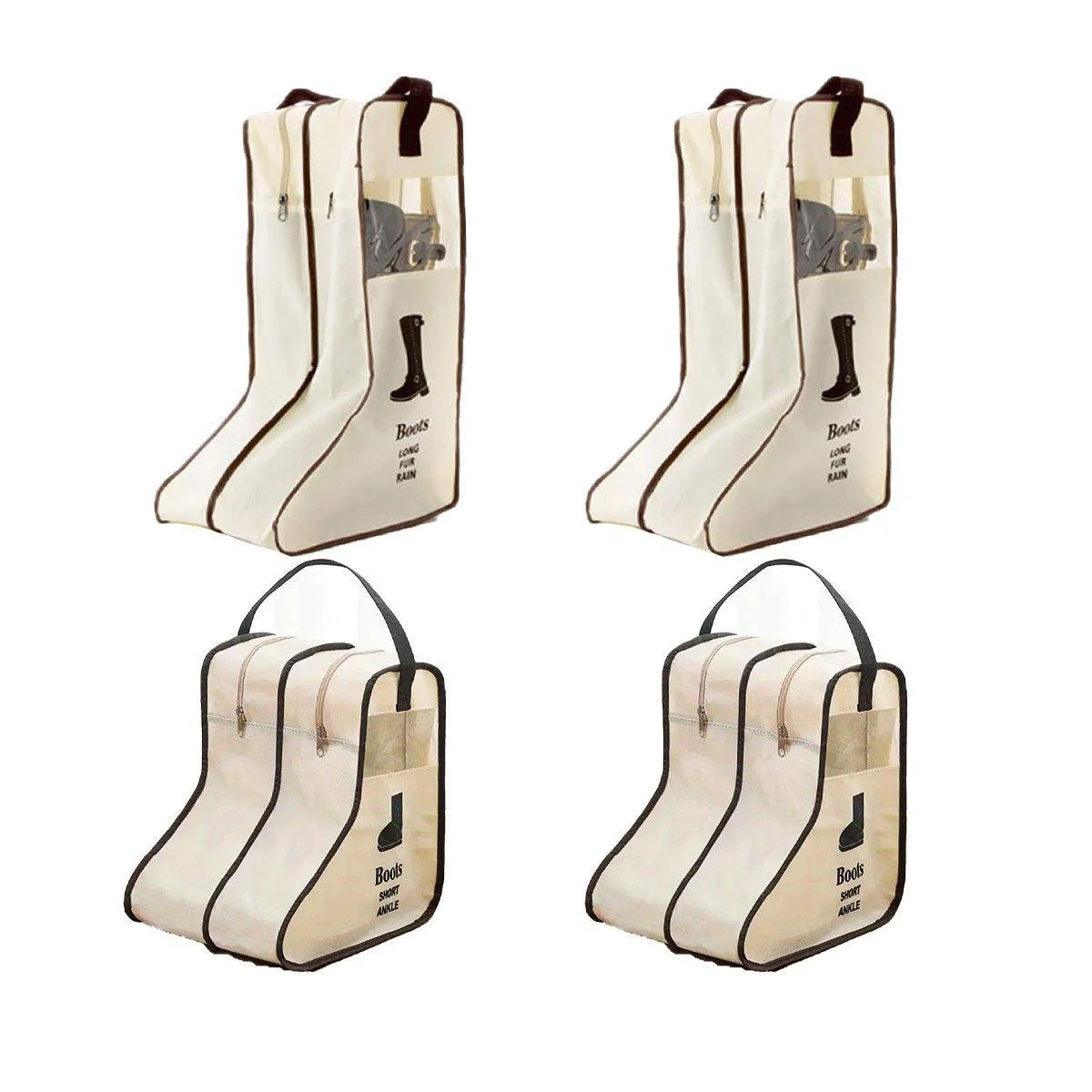 Organize and protect your shoes and boots with this set of 4 beige storage bags, ideal for both travel and home use. These durable bags are designed for both short and long boots, providing a dustproof solution that keeps your footwear clean and tidy. Each bag includes a transparent window for easy identification of contents, along with a secure zipper closure for quick access. The lightweight, portable design features an ergonomic handle, making it convenient to carry. Perfect for neatly storing shoes and saving space in your home or while travelling.