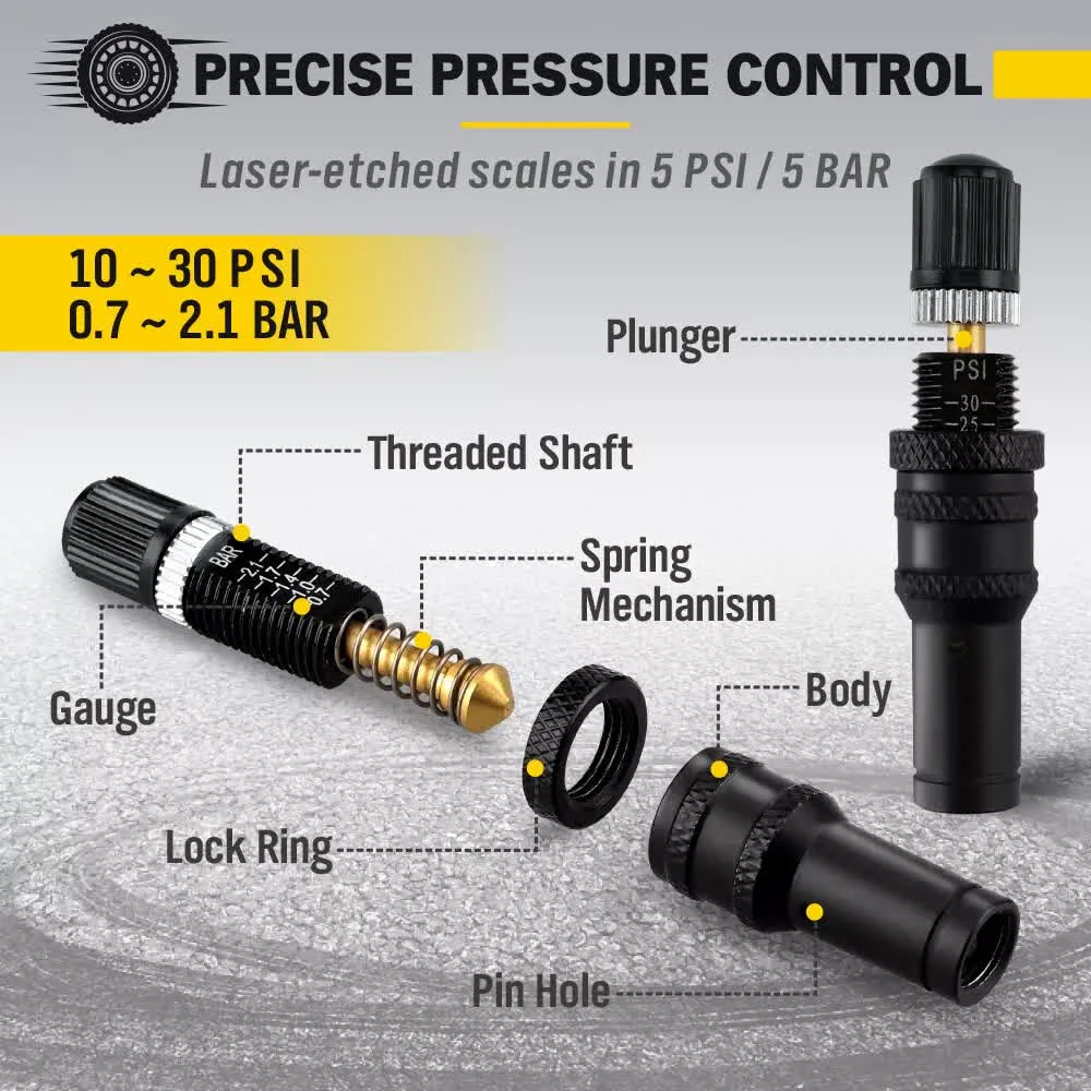 Superior Accuracy: Achieve the desired tyre pressure with laser-etched scales in 5 PSI (0.34 BAR) increments, boasting a narrow tolerance of ± 0.1 PSI (0.007 BAR).