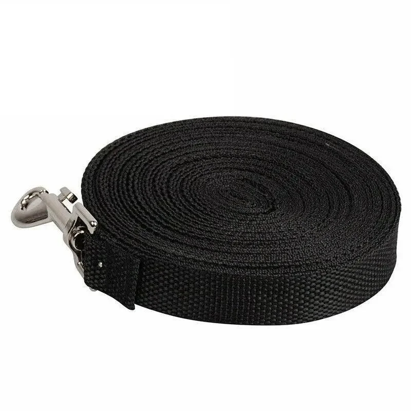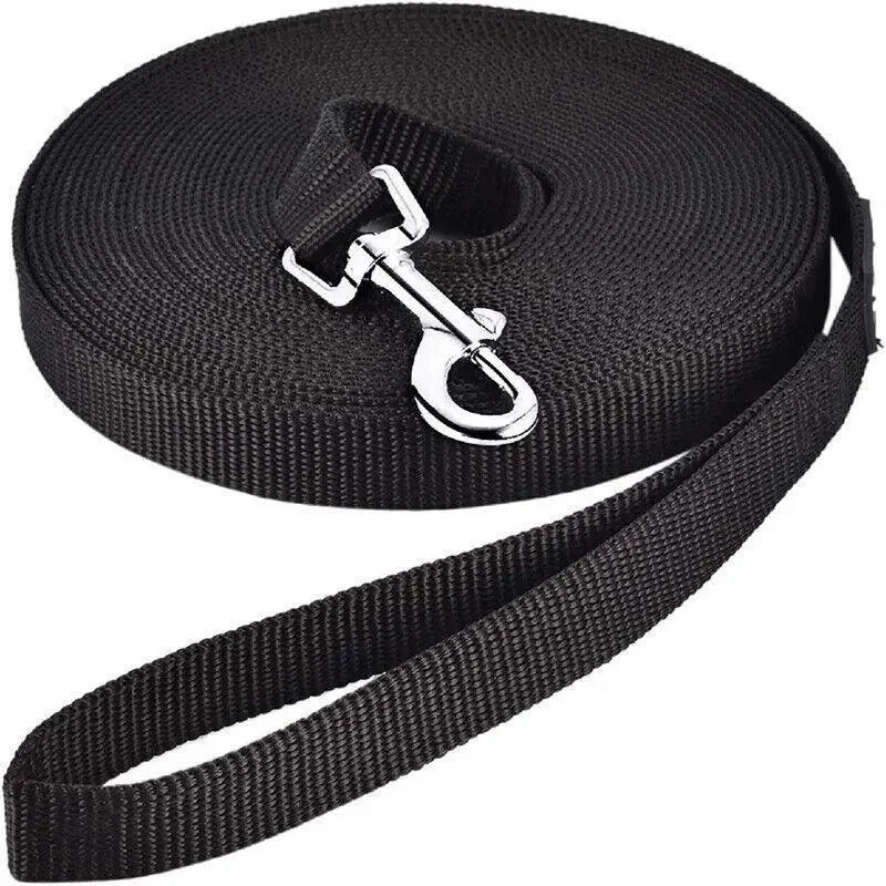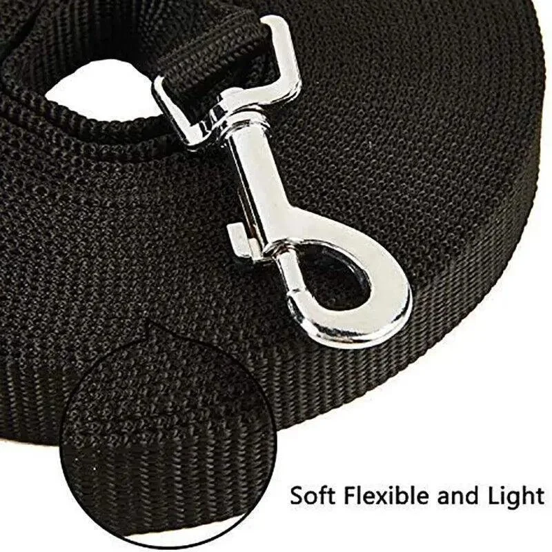 The leash is made of durable nylon of heavy duty and is equipped with a metal hook.