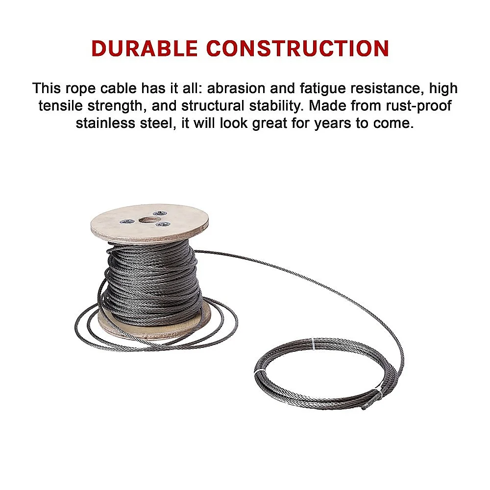 This rope cable has it all: abrasion and fatigue resistance, high tensile strength, and structural stability. Made from rust-proof stainless steel, it will look great for years to come and then some, with proper care. This cable has incredible strength, yet looks great in both residential and commercial applications. If you have a project that requires both strength and good looks, this wire rope is the perfect solution. Order yours today!