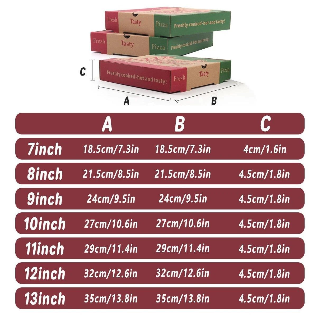 Versatile Sizes: Available in multiple sizes (7-13 inches) to accommodate different pizza dimensions, ensuring a snug fit for your product.
