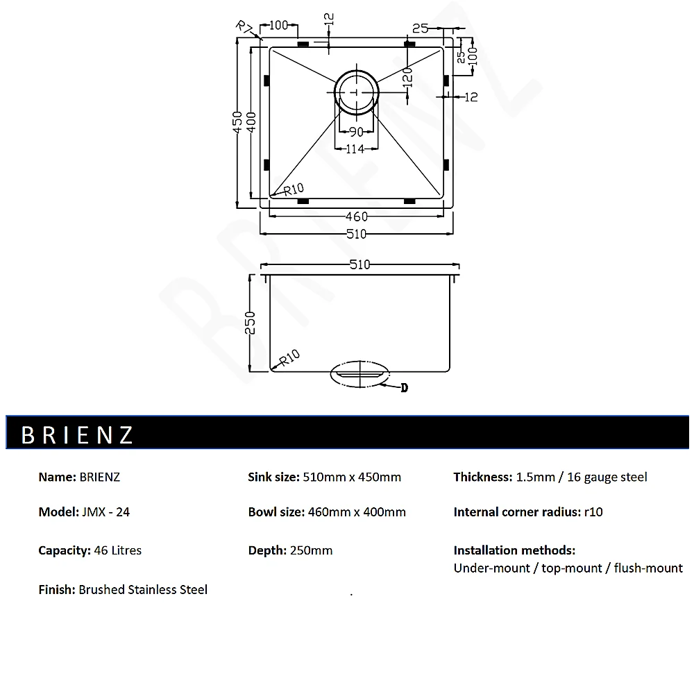 This single sink is made from hand-made 1.5mm-thick Type 304 stainless steel for a brilliant look that will last and last. It measures 510 x 450 x 250mm (L x W x D) with a 90mm drain opening and an above-average depth for added versatility. A strainer waste is included. Installation is either Undermount / Topmount-style. Undermount / Topmount brackets are included along with full installation instructions.