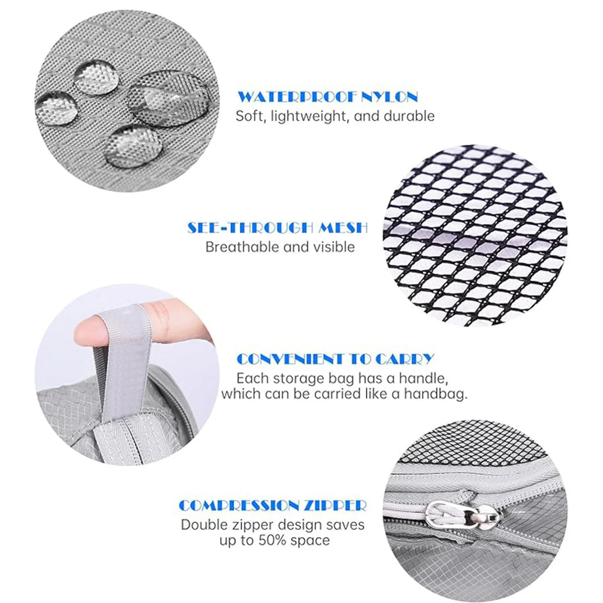 Streamline your travel experience with this 6-piece compression packing cube set.Made from water-resistant nylon with mesh panels, these organisers keep clothing ventilated and visible while protecting against moisture.The double-zipper system compresses clothes by up to 60%, saving valuable suitcase space.Ideal for business travel, holidays, or everyday storage needs, each cube includes a handle for easy transport and comes in stylish colour options.
