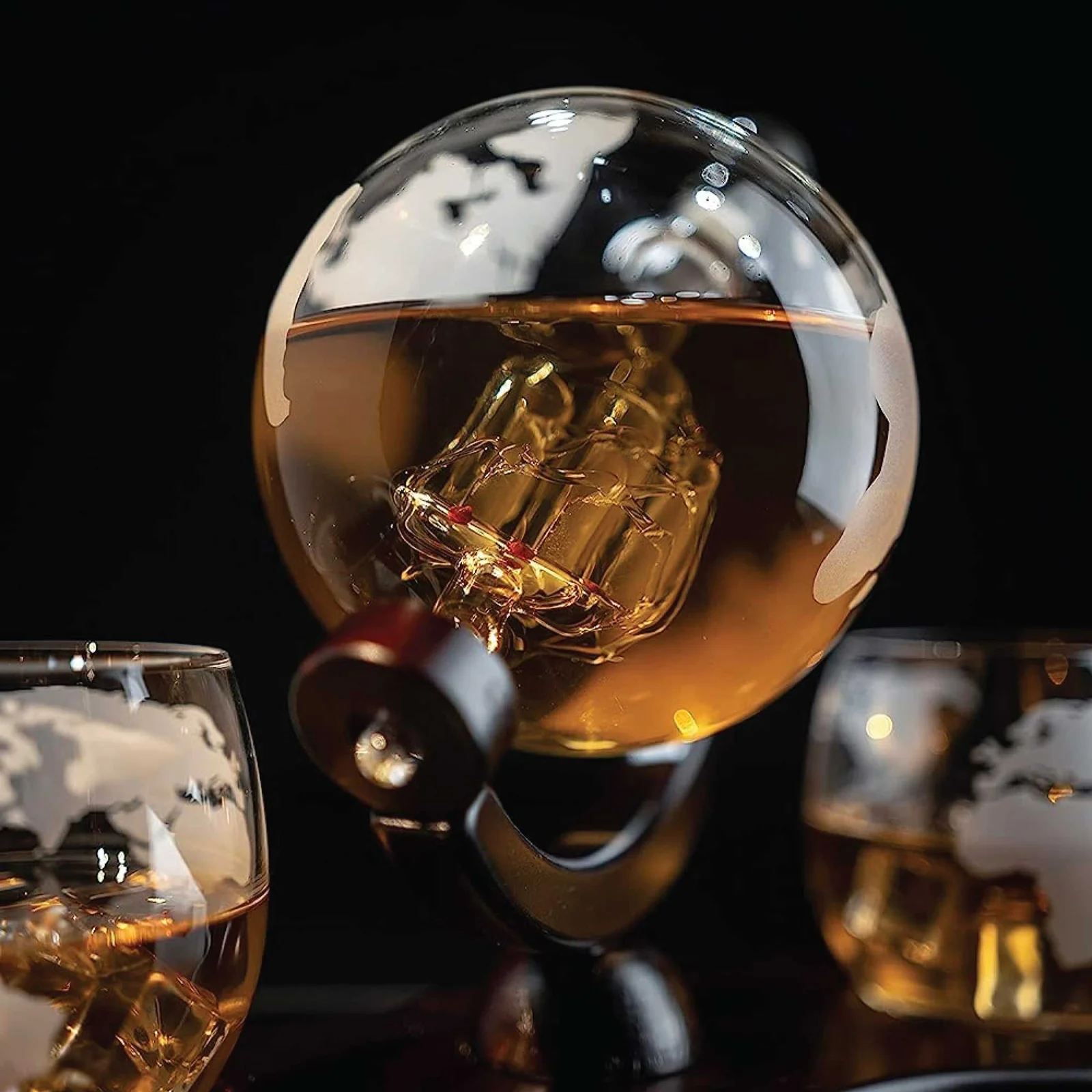 Artistic Design: The decanter holds a meticulously detailed antique ship inside a hand-blown globe. Each glasses features detailed globe etchings, adding a touch of sophistication and style to your home bar.