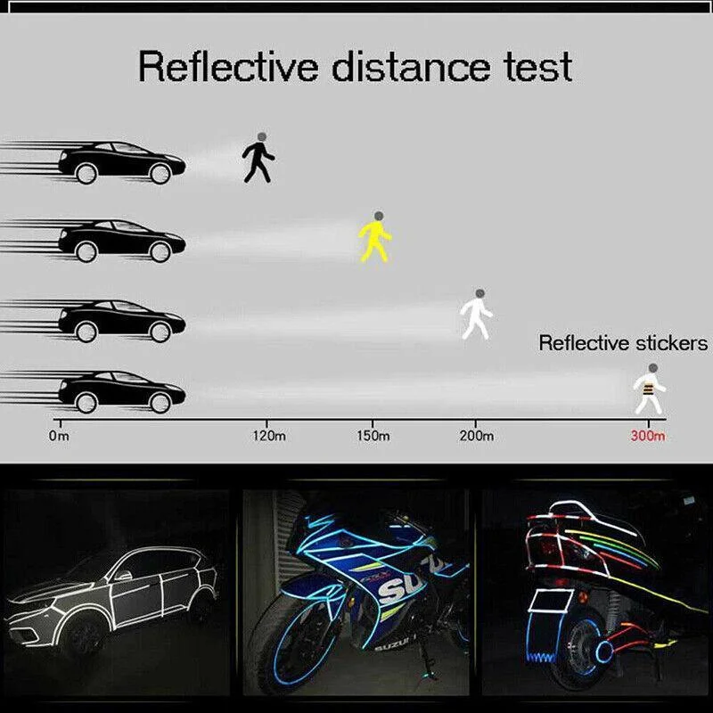 Improve nighttime visibility and add a stylish touch with this 8-meter reflective tape. Designed for bicycles, motorcycles, scooters, and cars, this hi-vis reflective strip uses prism-based microcrystalline cube technology to enhance reflectivity in low-light conditions. Whether applied to wheels, frames, helmets, or vehicle contours, the self-adhesive tape ensures a strong, durable hold on curved or flat surfaces. This bike reflective sticker is made of high-quality, waterproof and wear-resistant material that withstands sunlight, wind, and rain without fading or peeling. Easy to apply and available in multiple vibrant colors, it provides enhanced visibility and a stylish look for your ride.