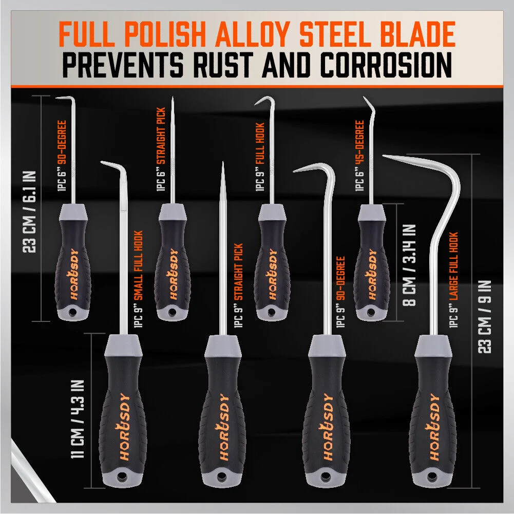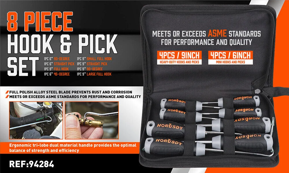 Heavy-duty hook and pick set has 8 shapes, suitable for any situation, and provides a drawing force specification of more than 200 pounds to complete your work excellently.