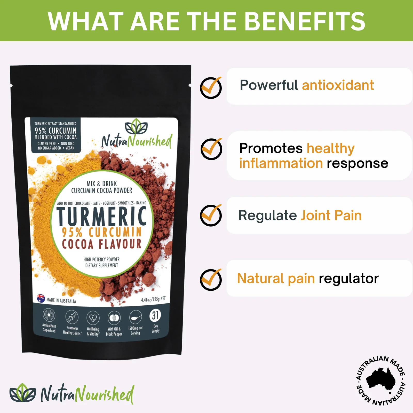 This product contains 95% pure curcumin powder, which is the highest purity that can be practically achieved. In order for the body to absorb as much as physically possible, black pepper has been added to increase absorption by 2000%. As mentioned, the powder also contains cocoa powder to add health benefits, aid absorption and boost taste.