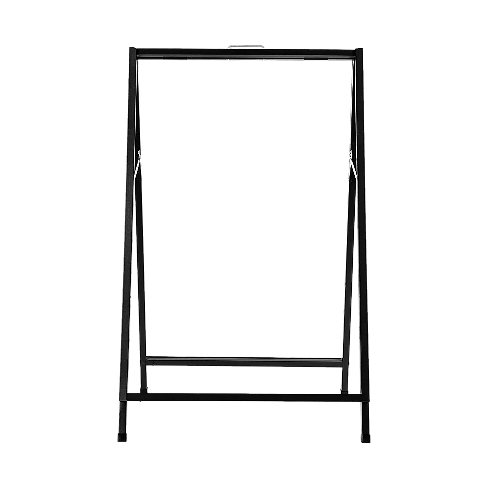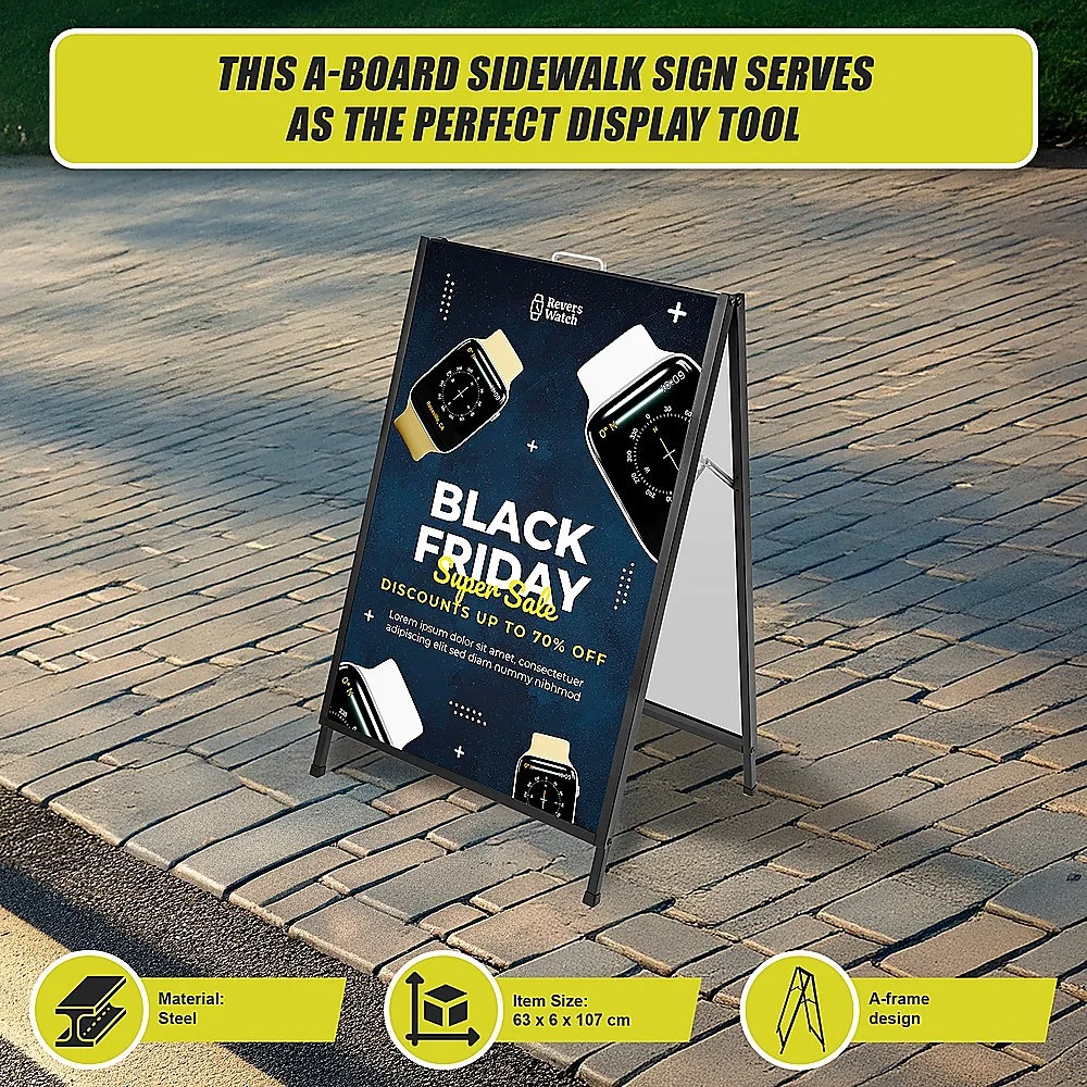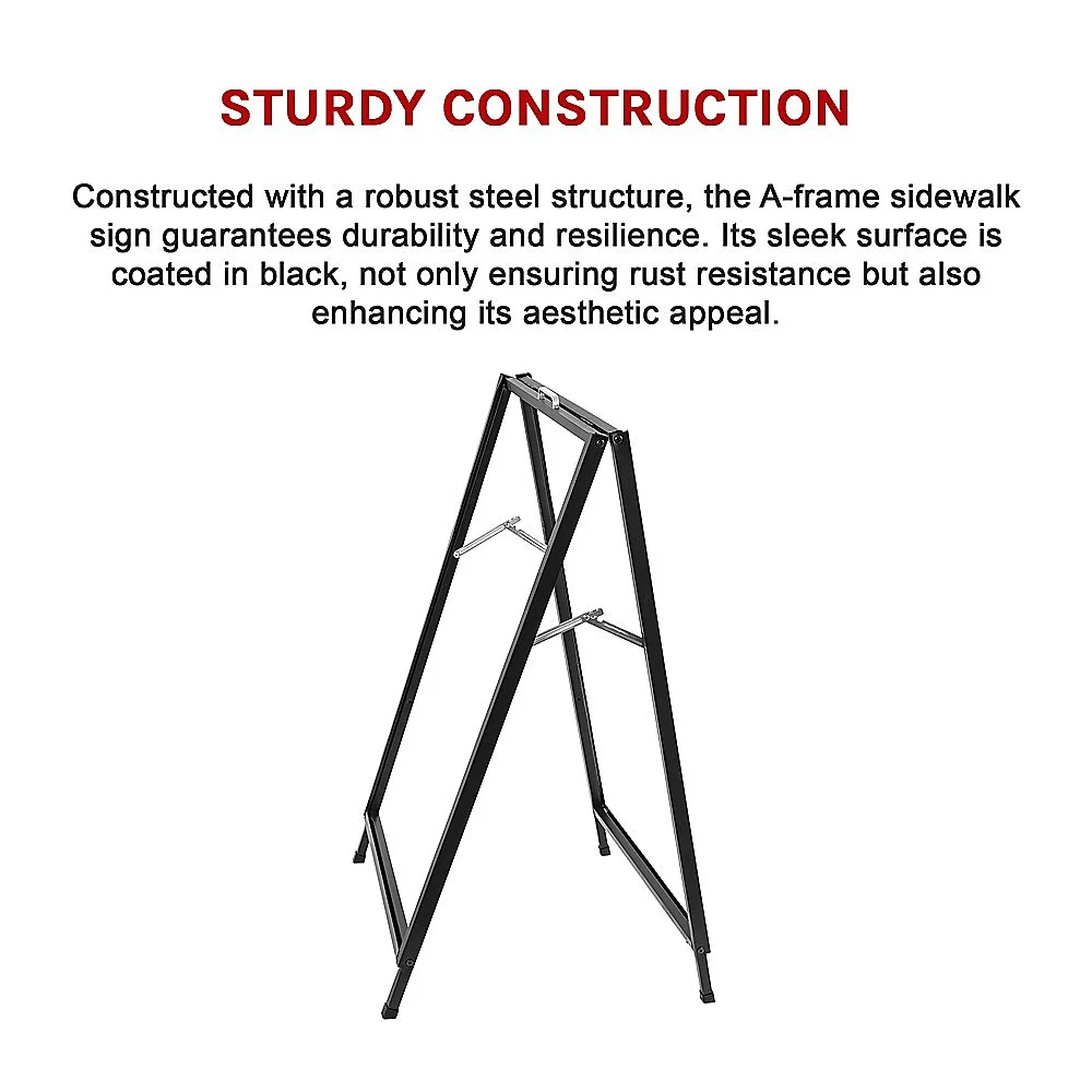 Constructed with a robust steel structure, the A-frame sidewalk sign guarantees durability. Its sleek surface is coated in black, not only ensuring rust resistance but also enhancing its aesthetic appeal. The A-frame configuration, coupled with anti-skid feet, ensures stability during use. Its lightweight material makes it portable and easy to carry.