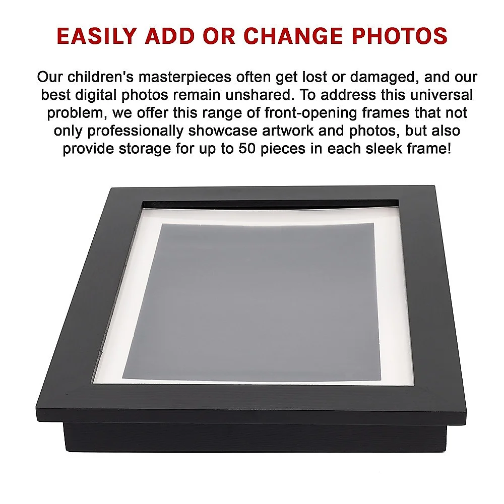 As proud parents, we all face the same dilemma: a collection of artwork and cherished photographs that we want to display. Often, we end up using our fridge as an impromptu art gallery and our computers as digital photo albums. Sadly, we rarely get to truly appreciate these treasures. Our children's masterpieces often get lost or damaged, and our best digital photos remain unshared.To address this universal problem, we offer this range of front-opening frames that not only professionally showcase artwork and photos, but also provide storage for up to 50 pieces in each sleek frame!