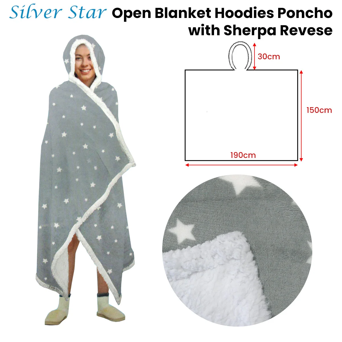 Wrap yourself with this luxurious Adult Men Women Open Blanket Hoodie Poncho with Sherpa Fleece Reverse Silver Star during chilly season and keep yourself warm and comfy all day long. It features a lovely sherpa design in soft colour hues of silver and white that will add a stylish accent to your space. It is made from strong and durable polyester fabric in 400gsm with easy care properties and softness you can enjoy all night long. For measurement refer to the image.