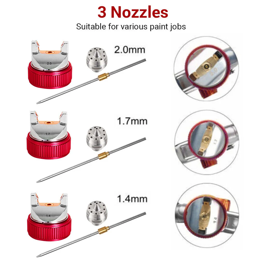 Adjustable: 1.4 / 1.7 / 2.0mm 3 size nozzles, easier to control. Adjust the spray cap to control the nozzle direction 360 direction controllable. Air spray gun 1.4mm tip with replaceable 1.7mm 2.0mm nozzle needle cap, wrench, nut and brush, which can fully meet your requirements