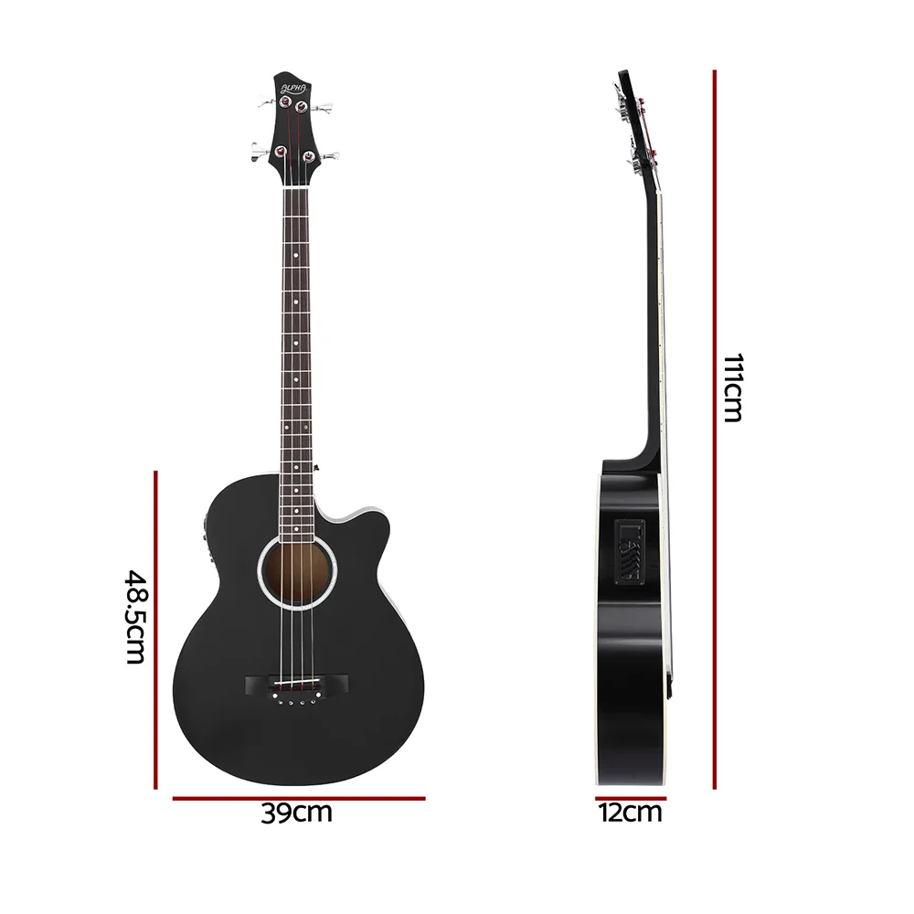 Unleash deep, rich tones with the Alpha 43-inch acoustic bass guitar. This full-size dreadnought type bass guitar features a powerful 4-band equalizer, allowing you to fine-tune your sound. With durable steel strings and a sleek black glossy finish, this Alpha guitar is built for impressive performance. It boasts a basswood body and catalpa wood neck, offering both quality craftsmanship and comfortable playability.