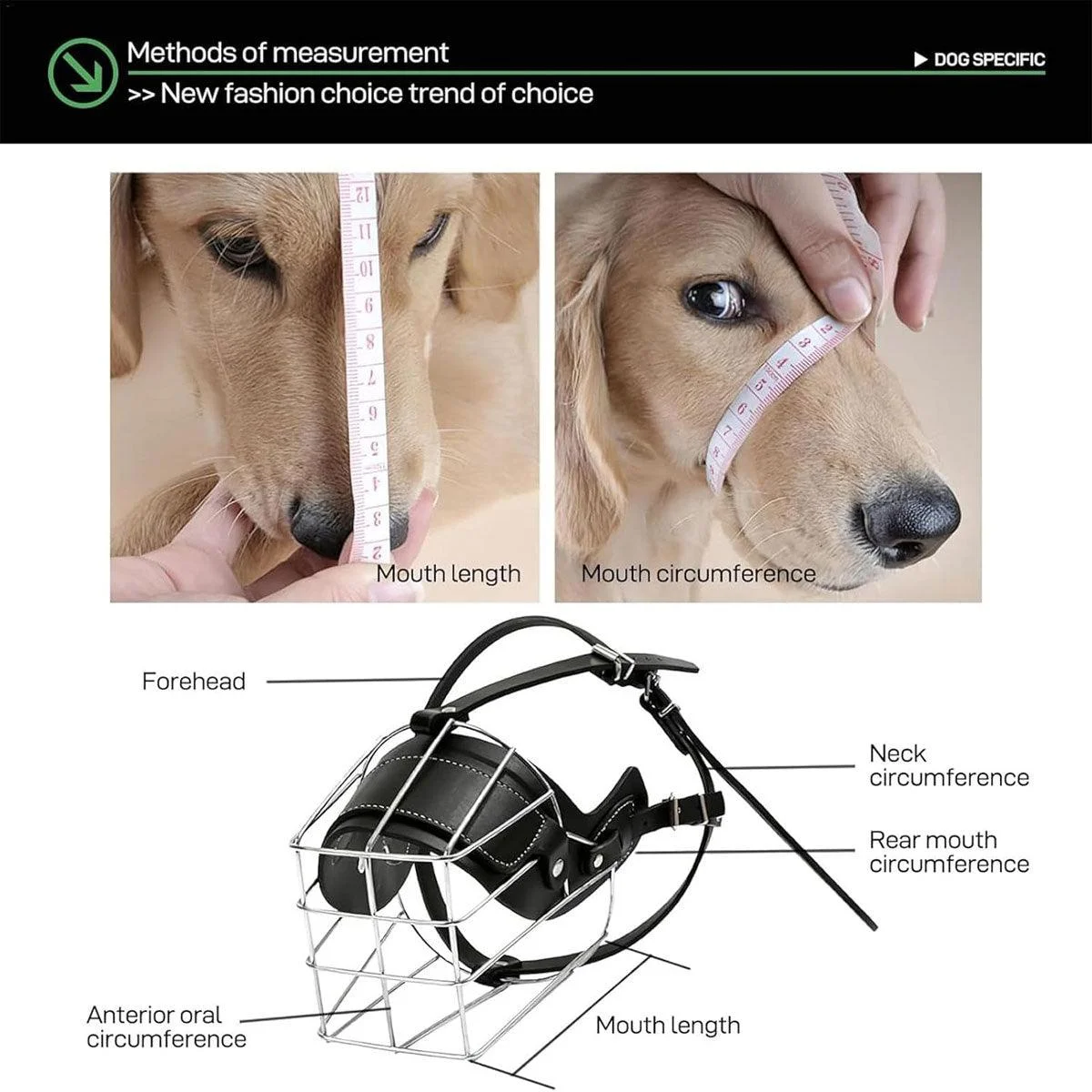 This durable dog muzzle features a sturdy stainless steel frame and a comfortable PU leather lining, providing effective protection for your pet. It helps prevent biting, barking, and eating harmful objects, making it ideal for training, vet visits, and outdoor walks. The adjustable straps ensure a secure and comfortable fit for different dog breeds. With its breathable design, your dog can pant and drink water freely while staying safe. Made from high-quality materials, this muzzle is rust-resistant and built for long-term use.